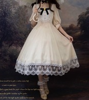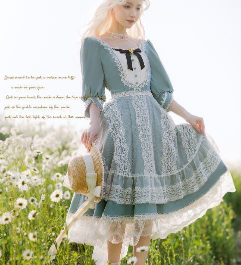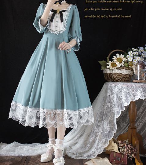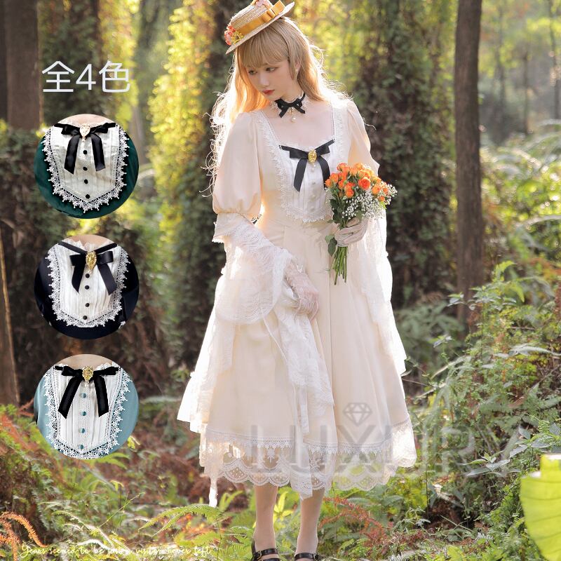 ロリータファッション/甘ロリ/ドレス/ワンピース/ワンピ/ミディアム丈/ワンピのみ/リボン/ミディアム丈/ミモレ丈/ひざ下丈/フレア/レース/フレア/半袖/フリル/ふんわり/森ガール/ドール/姫ロリ/エレガント/上品/レトロ/お茶会/撮影/舞台/撮影用/クリスマス/バレンタイン/イベント/結婚式/ウェディング/二次会/謝恩会/デート/お呼ばれ/パーティー/デート