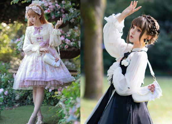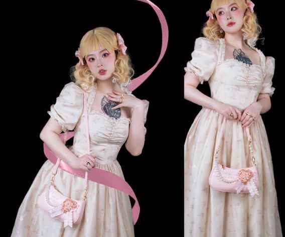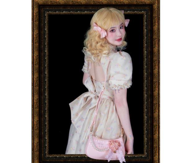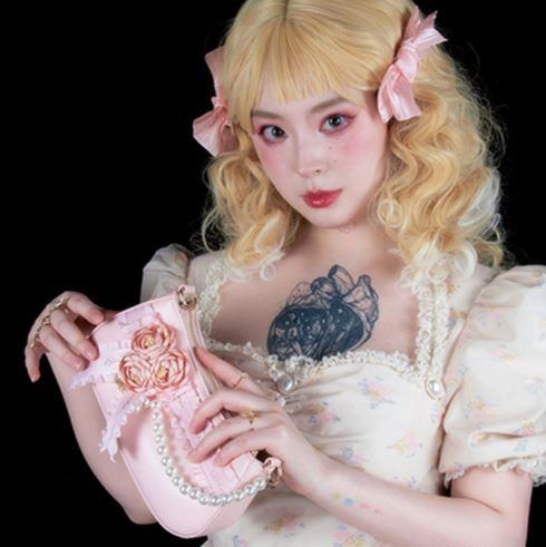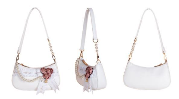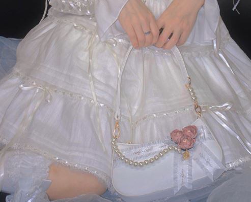 パーティバッグ 2色 LovelyLota ホワイト ピンク バラ フラワーモチーフ ビジュー リボン フリル かわいい 上品 エレガント プレゼント 撮影 イベント デート Lolita ロリィタ ゴスロリ ロリータファッション loli5277