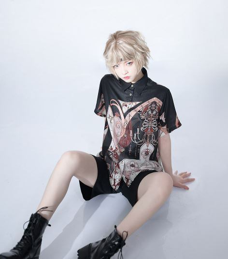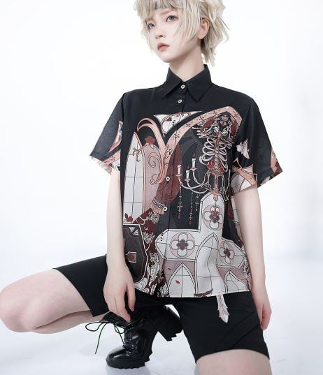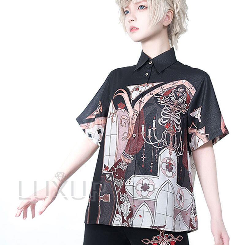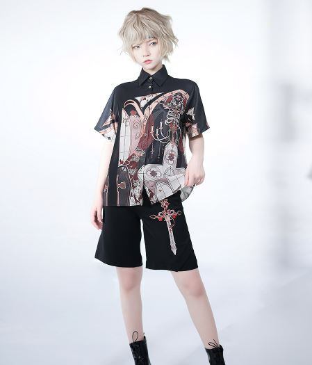 プリントブラウス princess Chronicles 春夏 半袖 トップス 柄 プリント 十字架 男装 ゴシック 前開き Lolita ロリィタ ゴスロリ ロリータファッション loli5441