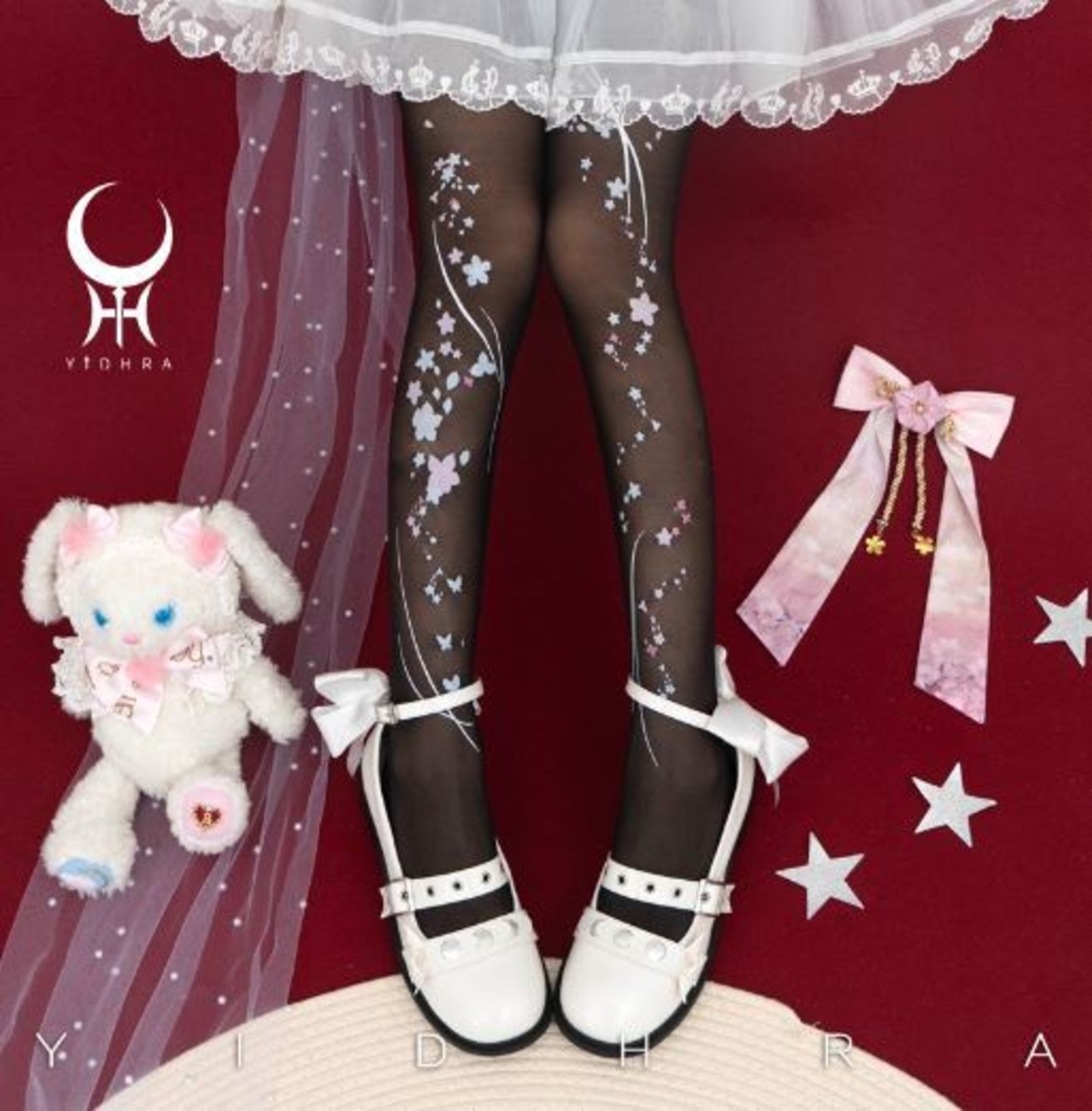 プリントストッキング 2色 Yidhra 春夏 春秋 通年 雑貨 小物 タイツ ストッキング 20D 甘ロリ 姫ロリ クラロリ 花柄 透け感 アシメ フラワーモチーフ リボン Lolita ロリィタ ゴスロリ ロリータファッション loli5456