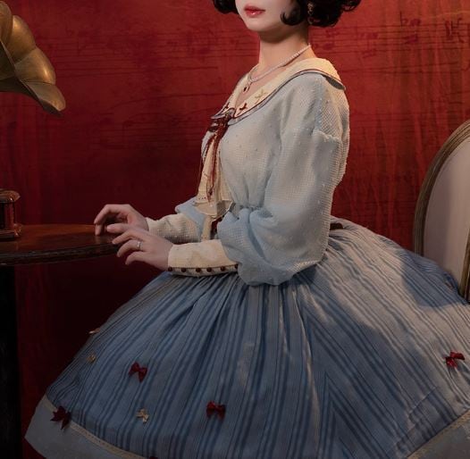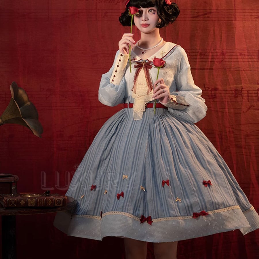ワンピース ドレス 白雪姫 アリス ミディアム丈 ふんわり フレア ウエストマーク 長袖 パフスリーブ ブルー 大きいサイズ サイズ豊富 Lolita ロリィタ ゴスロリ ロリータファッション loli5486