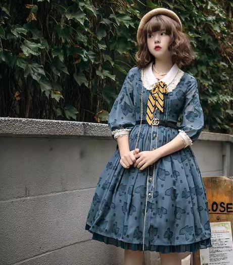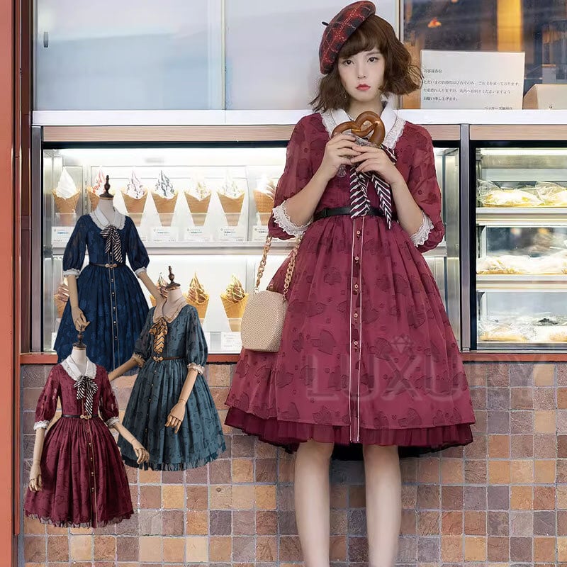 ロリータファッション/甘ロリ/姫ロリ/ワンピース/ワンピ/襟付き/半袖/ミディアム丈/ひざ丈/ウエストマーク/プリント/ドール/フレア/森ガール/メイド/メイド風/エレガント/上品/レトロ/お茶会/撮影/舞台/撮影用/発表会/クリスマス/バレンタイン/イベント/結婚式/ウェディング/二次会/謝恩会/デート/お呼ばれ/パーティ/デート