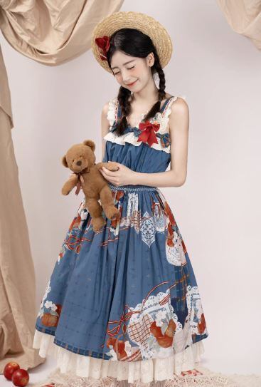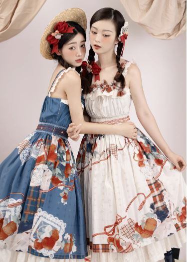 【納期60日】りんごジャンスカ 2色 Lo−cyan lolita JSK プリント ホワイト ブルー リボン ミディアム丈 ひざ下丈 ロング丈 ノースリーブ Aライン JSKのみ 甘ロリ 森ガール Lolita ロリィタ ゴスロリ ロリータファッション loli5513