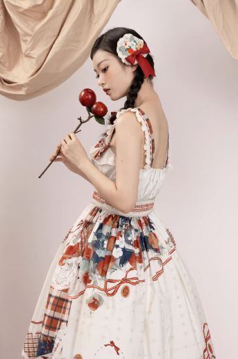 ロリータファッション/甘ロリ/姫ロリ/ジャンパースカート/ジャンスカ/JSK/ミディアム丈/ひざ下丈/ロング丈/フリル/ノースリーブ/Aライン/フレア/りんご/リンゴ/アップル/リボン/森ガール/メイド/メイド風/エレガント/上品/レトロ/お茶会/撮影/舞台/撮影用/発表会/クリスマス/バレンタイン/イベント/結婚式/ウェディング/二次会/謝恩会/デート/お呼ばれ/パーティ/デート