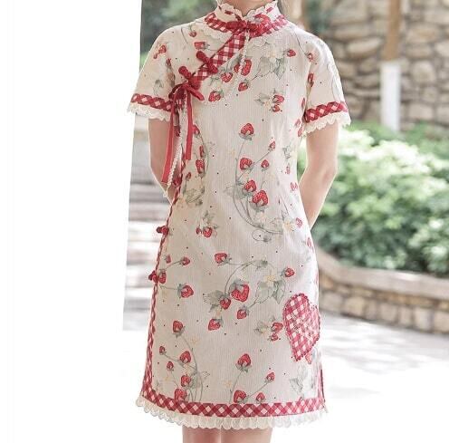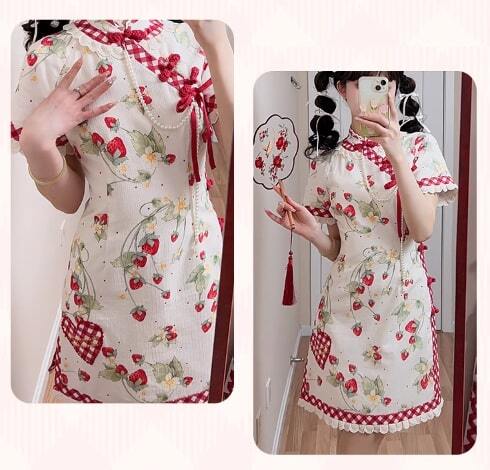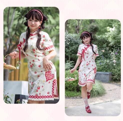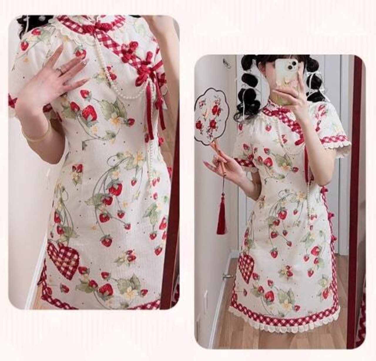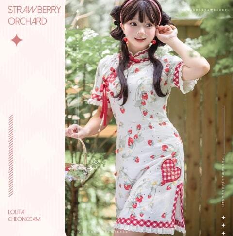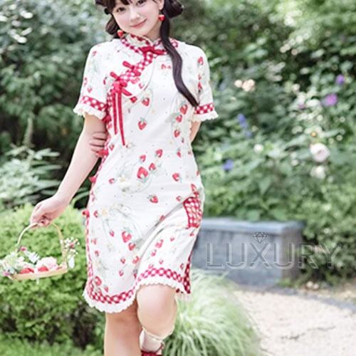 ロリータファッション/チャイナドレス/春夏/いちご/ストロベリー/プリント/総柄/リボン/ミディアム丈/ひざ丈/森ガール/メイド/メイド風/エレガント/上品/レトロ/お茶会/撮影/舞台/撮影用/発表会/クリスマス/バレンタイン/イベント/結婚式/ウェディング/二次会/謝恩会/デート/お呼ばれ/パーティ/デート
