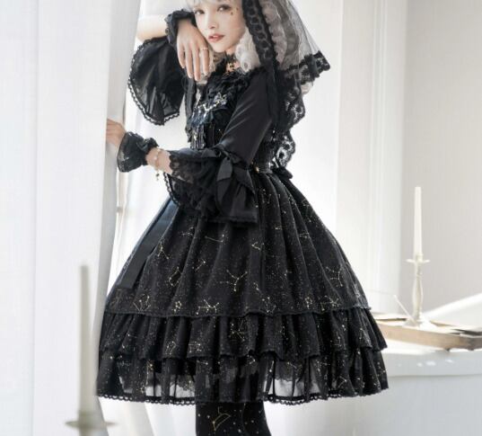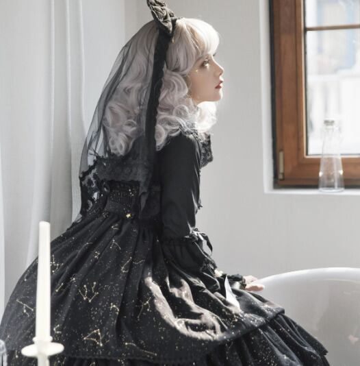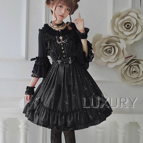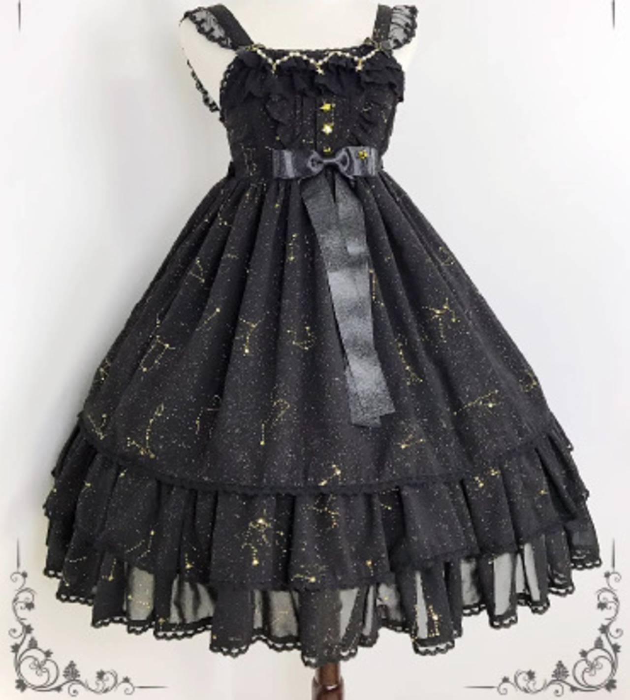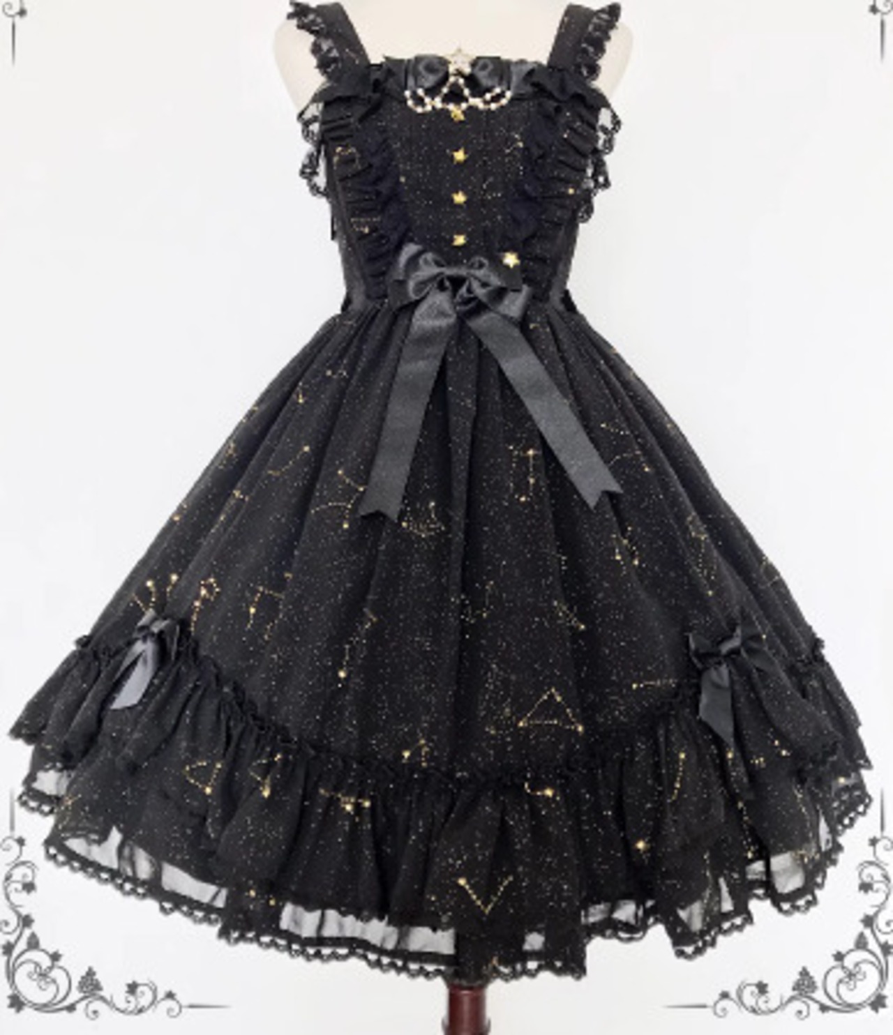 ブラックレースにラメの星座モチーフをあしらった、ドレスライクなジャンスカです。JSKのみの販売です。