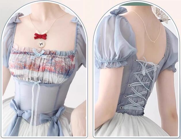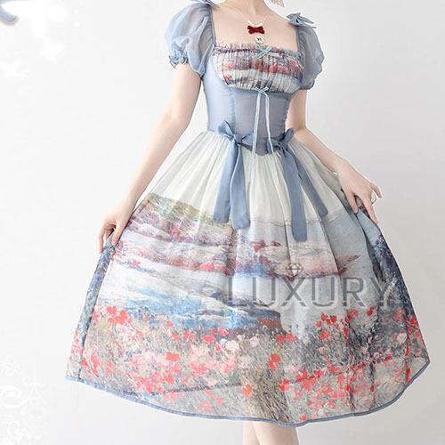 ロリータワンピース ミモレ丈 パフスリーブ ブルー レッド 油絵 プリント 甘ロリ 姫系 ふりふり ひらひら リボン シフォンお嬢様 かわいい クラシカル