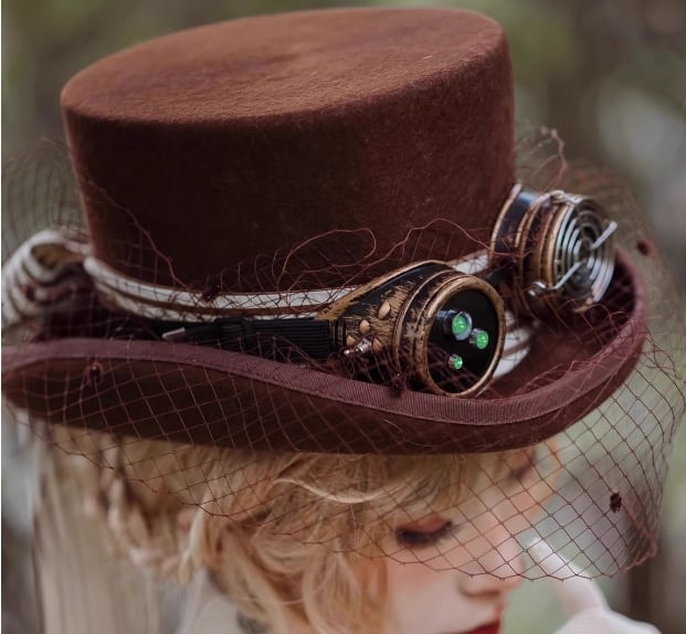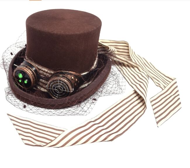 スチームパンク 帽子 トーク帽風 ハット ウール メッシュ ベール ゴーグル リボン 茶色 ブラウン ストライプ セレブ 貴族風 ロココ調風 17世紀風 レトロ かわいい かっこいい コスプレ イベント
