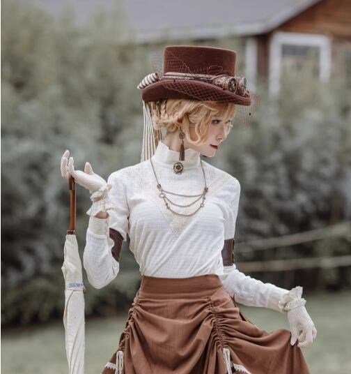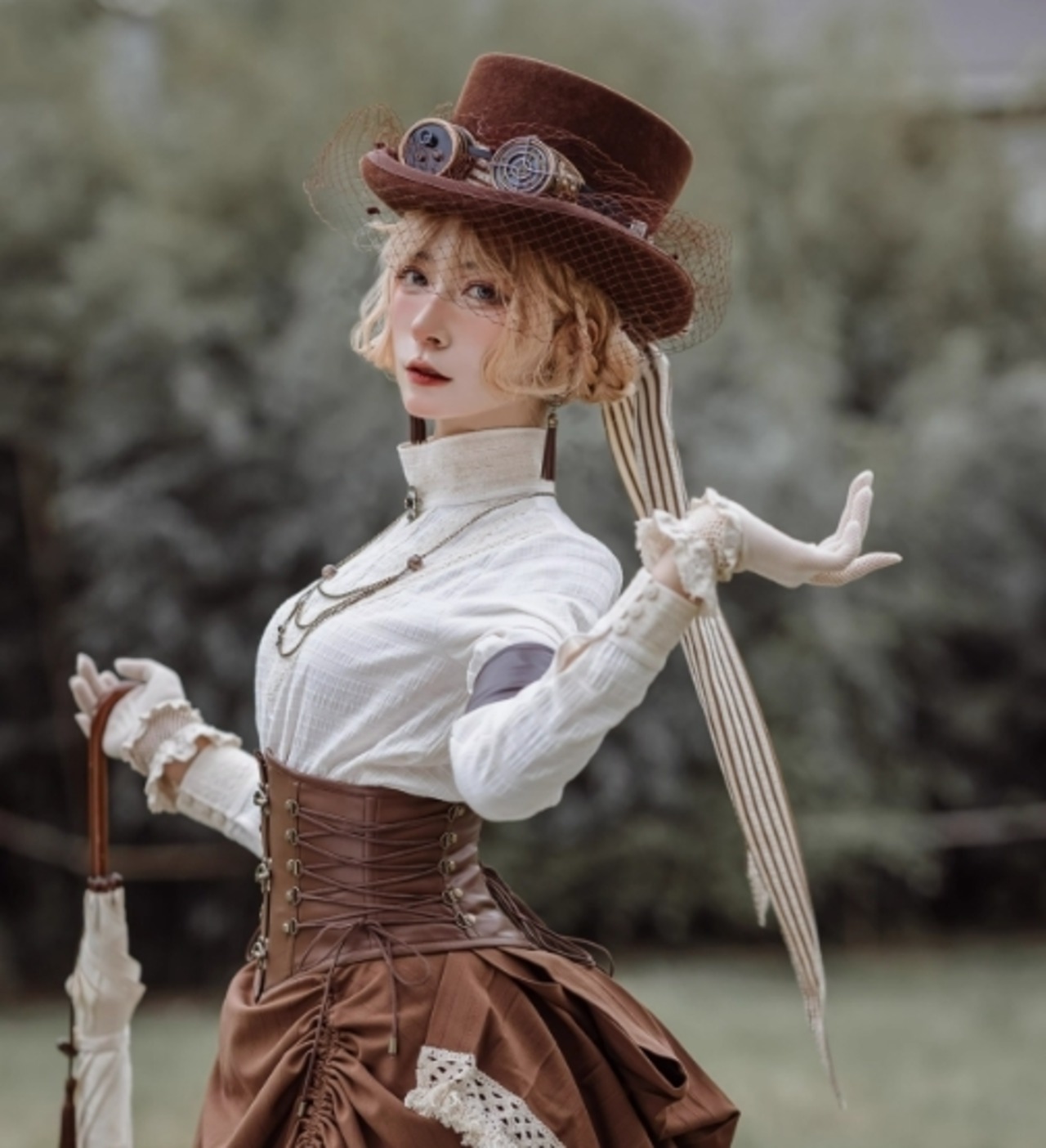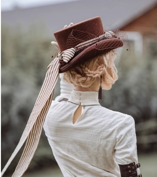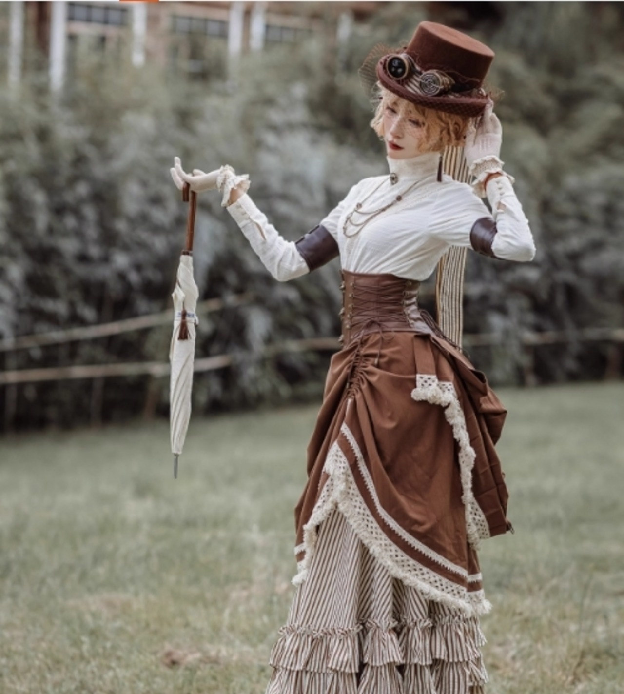 ブラウン×ストライプ柄とメッシュベールが、17世紀風の貴族風スタイルを演出します。