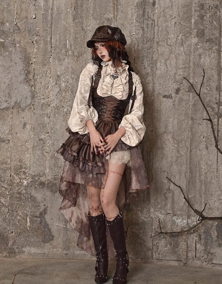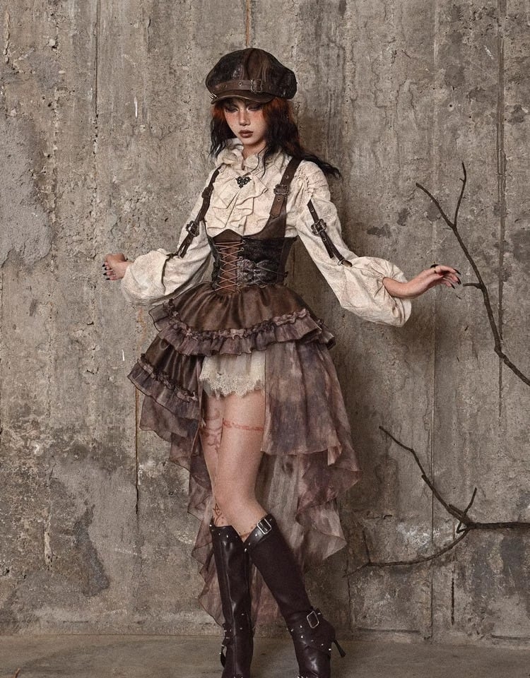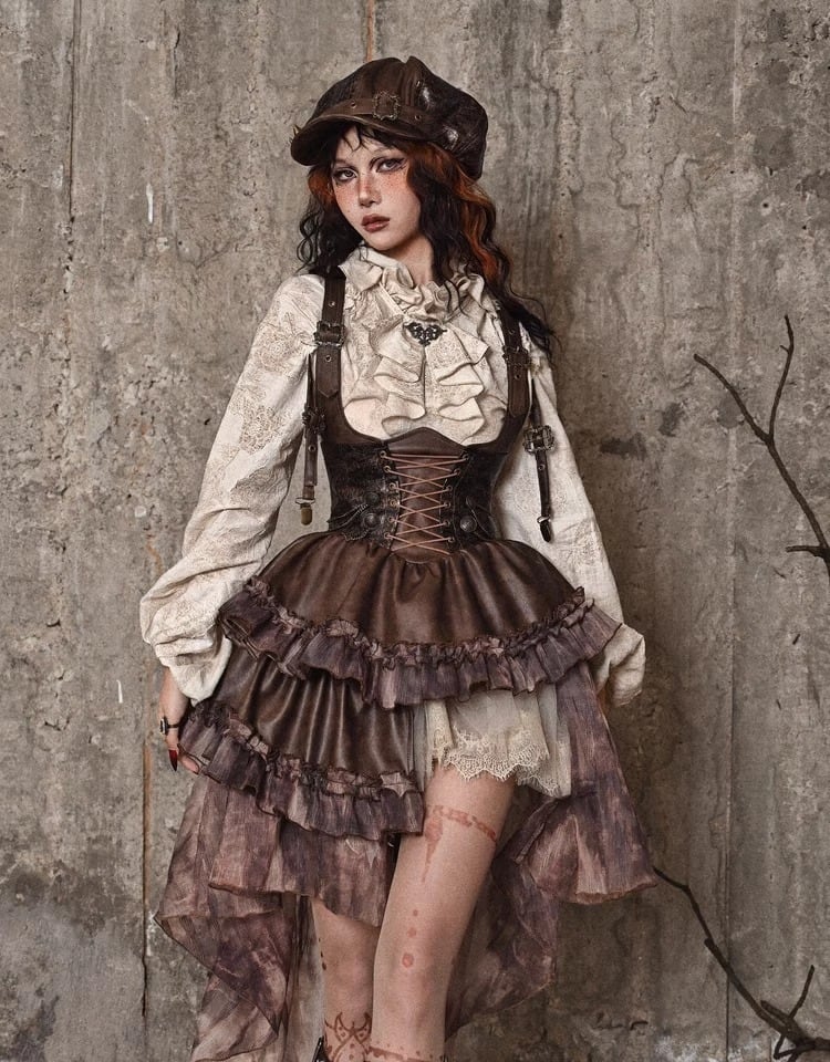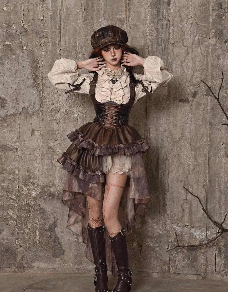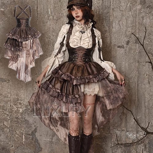 スチームパンク ジャンパースカート ミニ丈 ショート丈 レースアップ アシンメトリー フリル ブラウン セクシー 可愛い