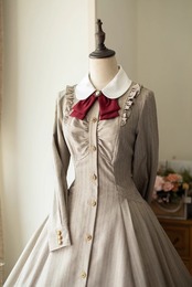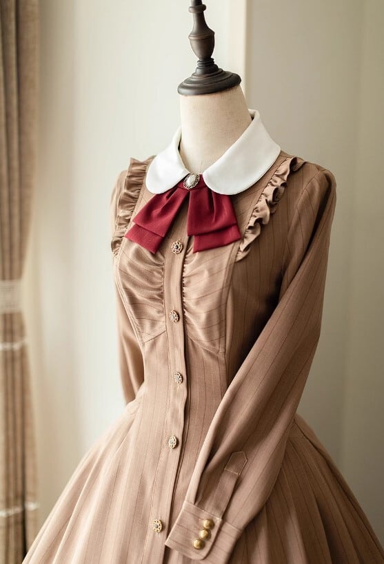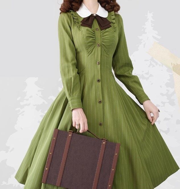 ワンピース 長袖 膝丈 ミディアム丈 クラシカル ストライプ フレアワンピ 丸襟 ヘッドアクセ付き 女学院 女学生 卒業式