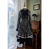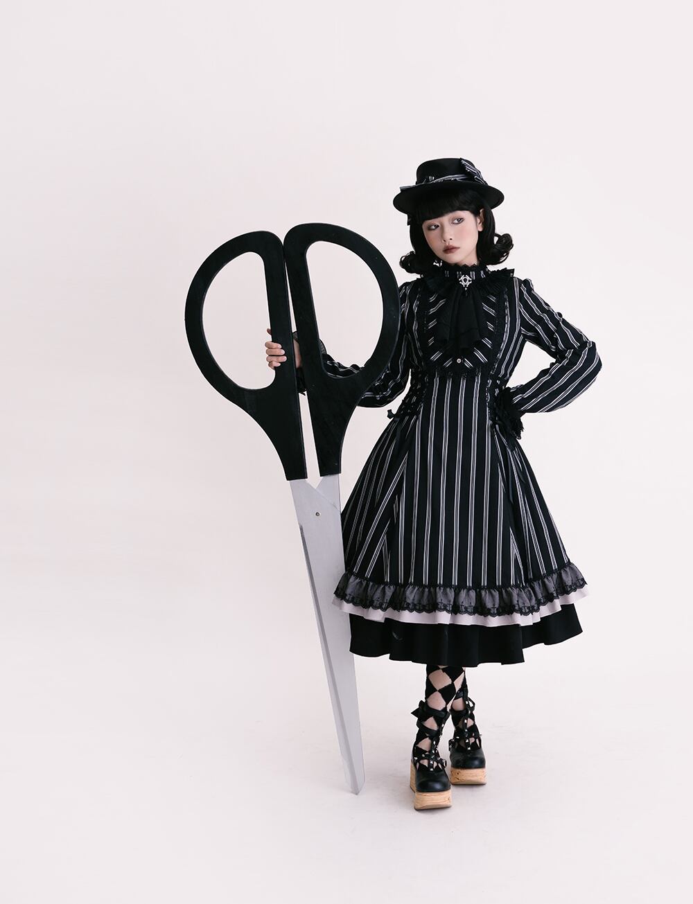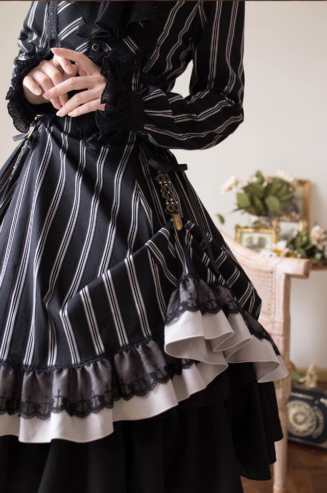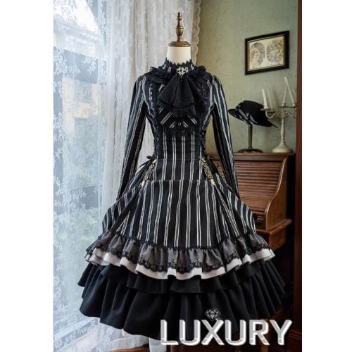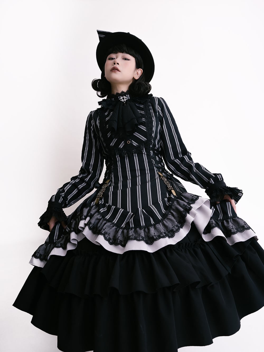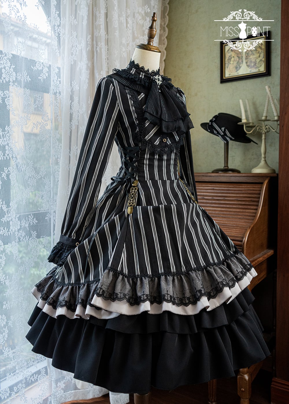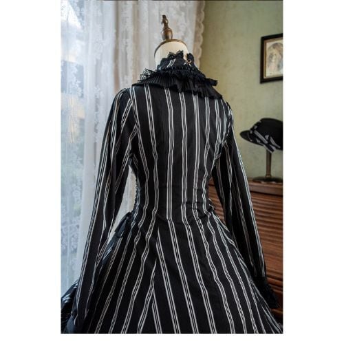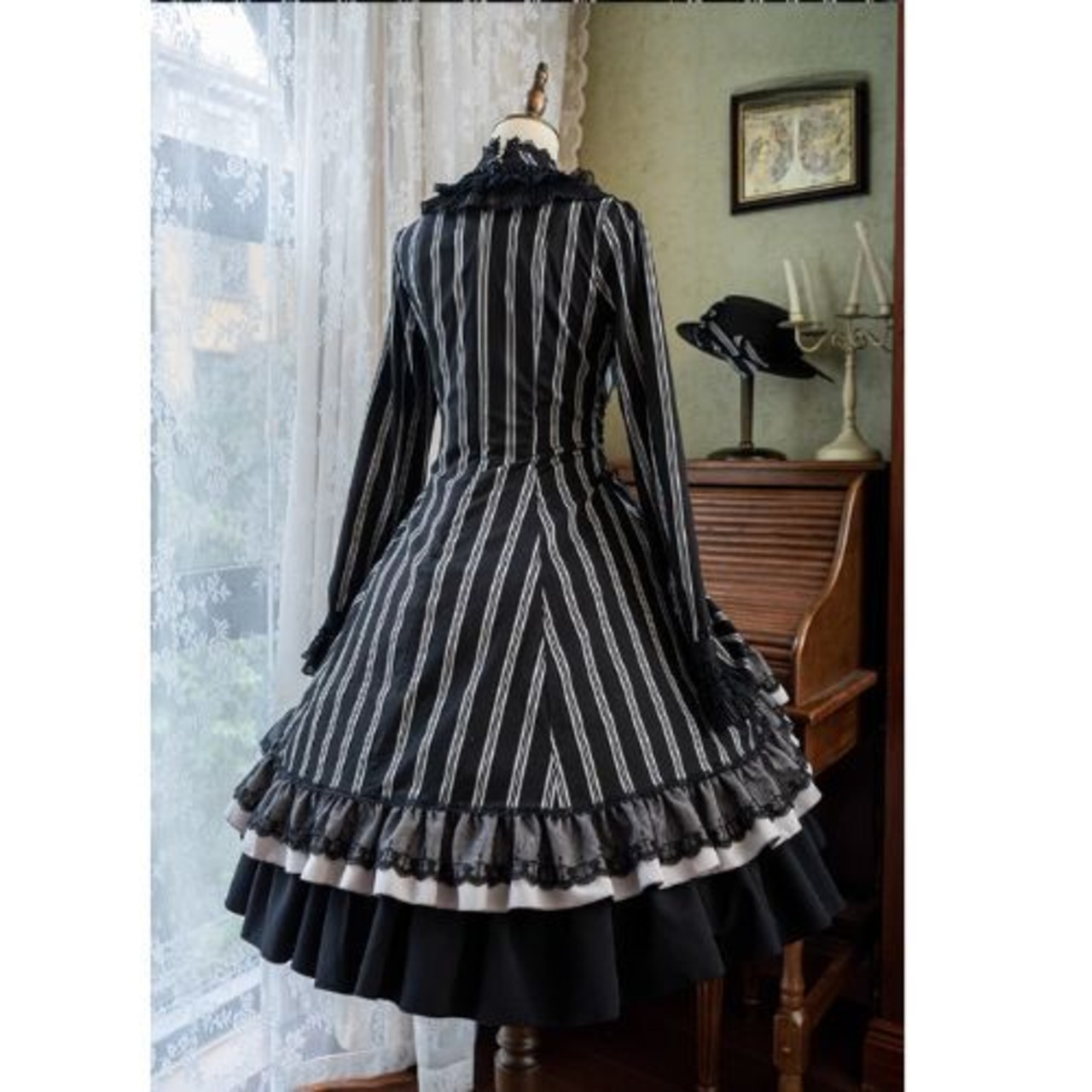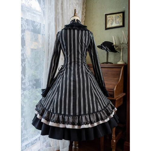 【納期40日】ロリータワンピース ロリータドレス OP ゴシック ハイネック レトロ ストライプ柄 クラシカル エレガント パフスリーブ 姫袖 フリル 長袖 ミディアム丈 春 秋 冬 ゴスロリ クラロリ 学院風 お嬢様 甘ロリ パーティー デート 貴族風 クラシック レディースファッション