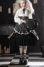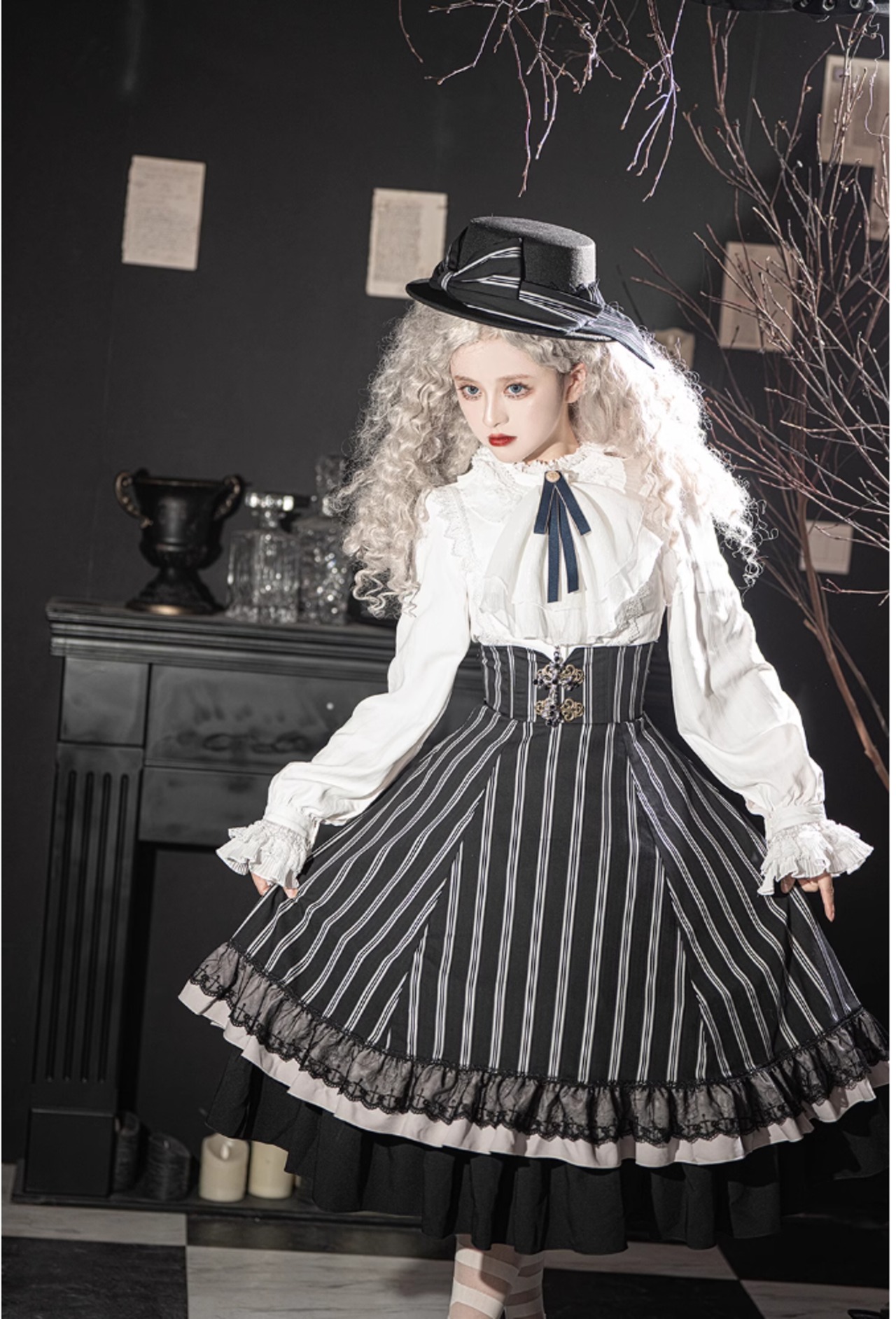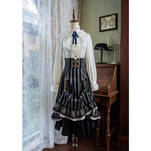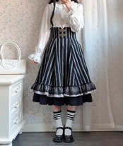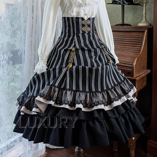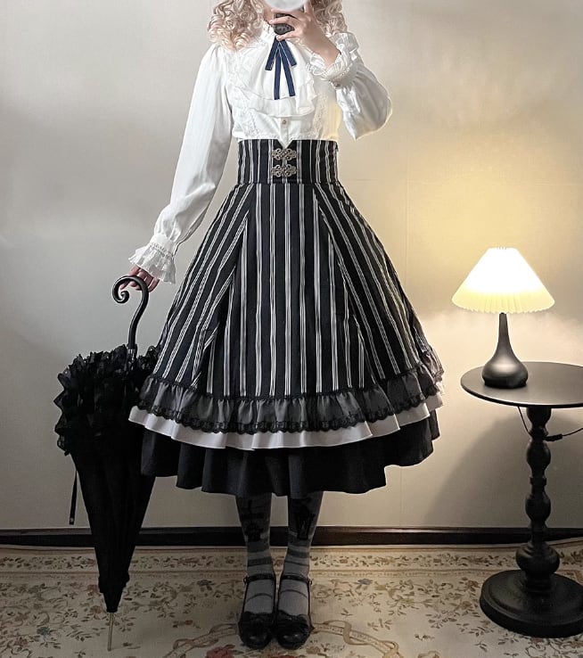 【納期40日】ロリータファッション スカート ゴシック レトロ ストライプ柄 クラシカル エレガント フリル ミディアム丈 春 秋 冬 ゴスロリ クラロリ 学院風 お嬢様 甘ロリ パーティー デート 貴族風 クラシック レディースファッション
