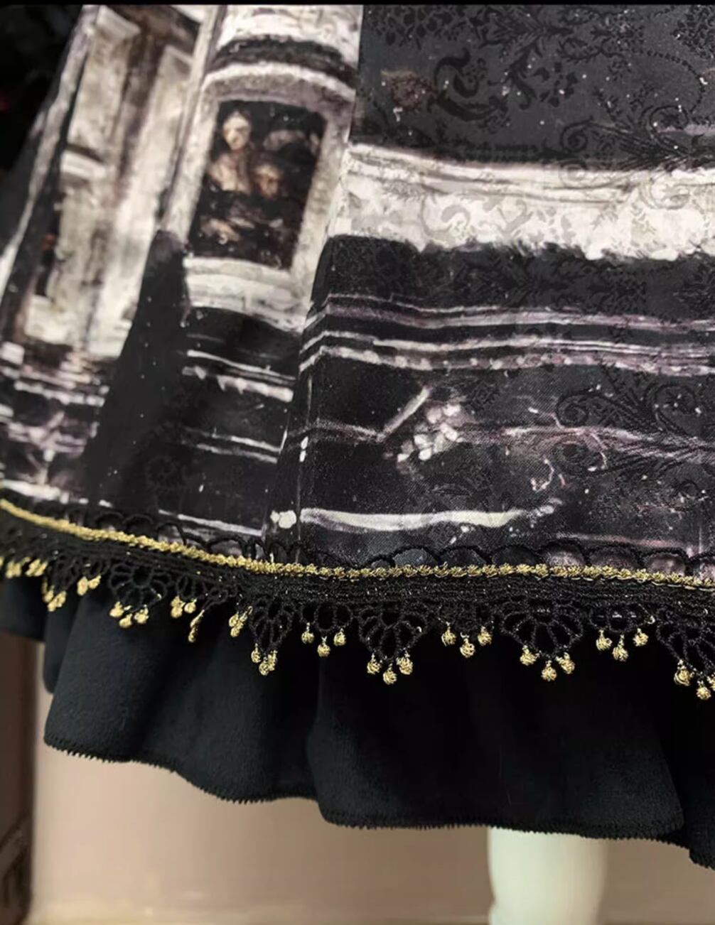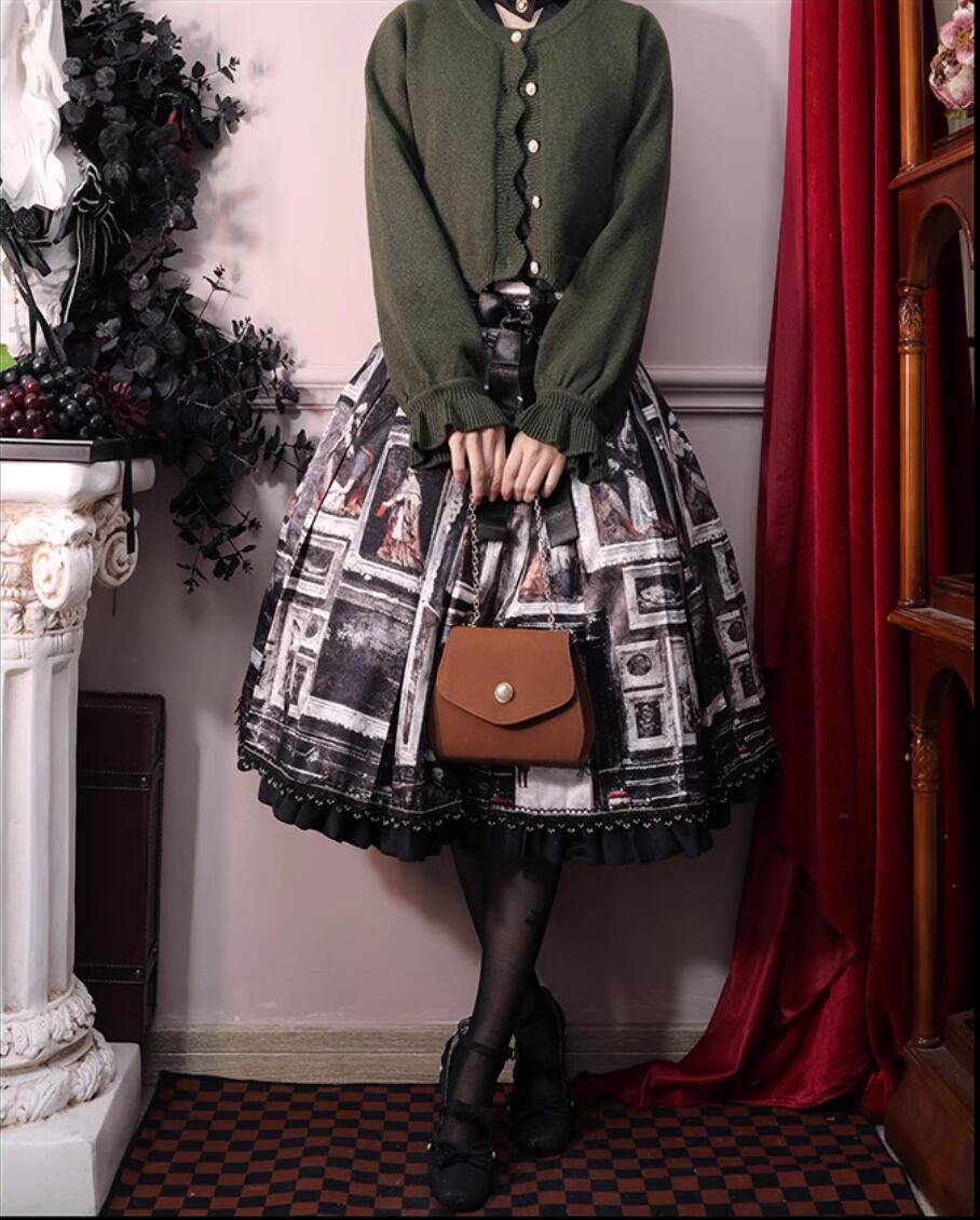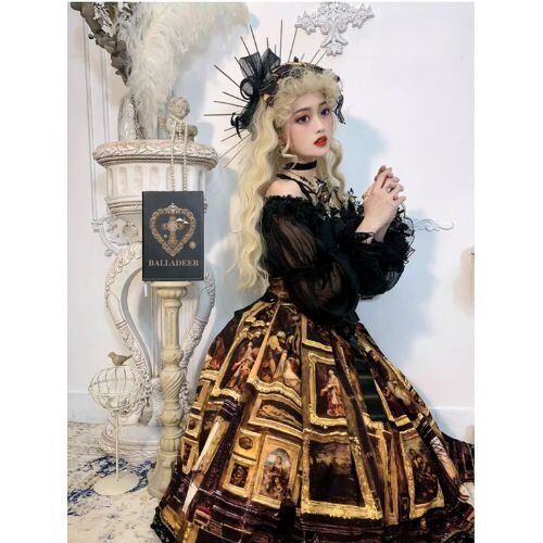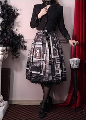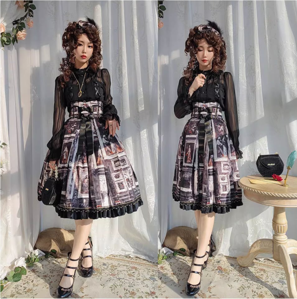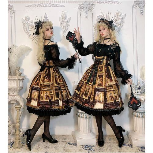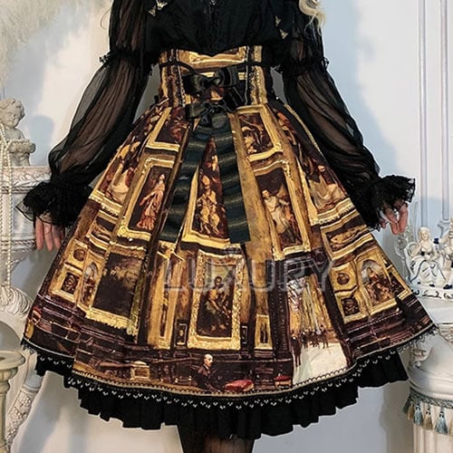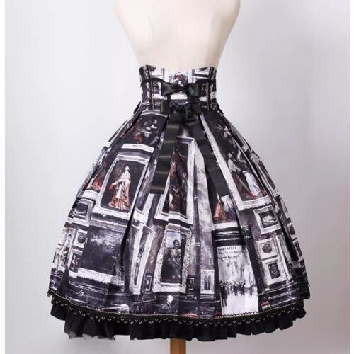【9月中旬発送予定】ロリータファッション ゴシック スカート ミディアム丈 ハイウエスト コルセット風 アート柄 クラシカル エレガント Aライン 春 夏 秋 お嬢様 レトロ ヴィンテージ レディース