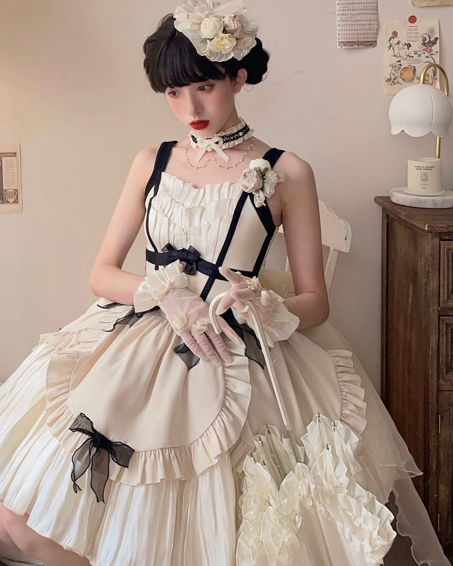ロリータワンピース ジャンパースカート 甘ロリ クラロリ リボン アイボリー ひざ下丈 ミモレ丈 お嬢様 お姫様 バレエ スウィート 上品 エレガント お呼ばれ パーティー 撮影 loli5673