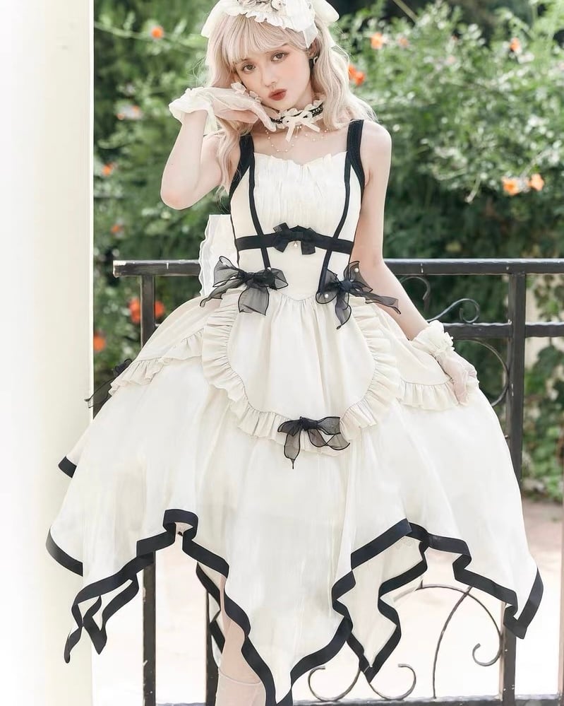 ロリータワンピース ジャンパースカート 2way ロリータファッション 甘ロリ クラロリ リボン アイボリー 2way ひざ下丈 ミモレ丈 お嬢様 お姫様 バレエ スウィート 上品 エレガント お呼ばれ パーティー 撮影 loli5673