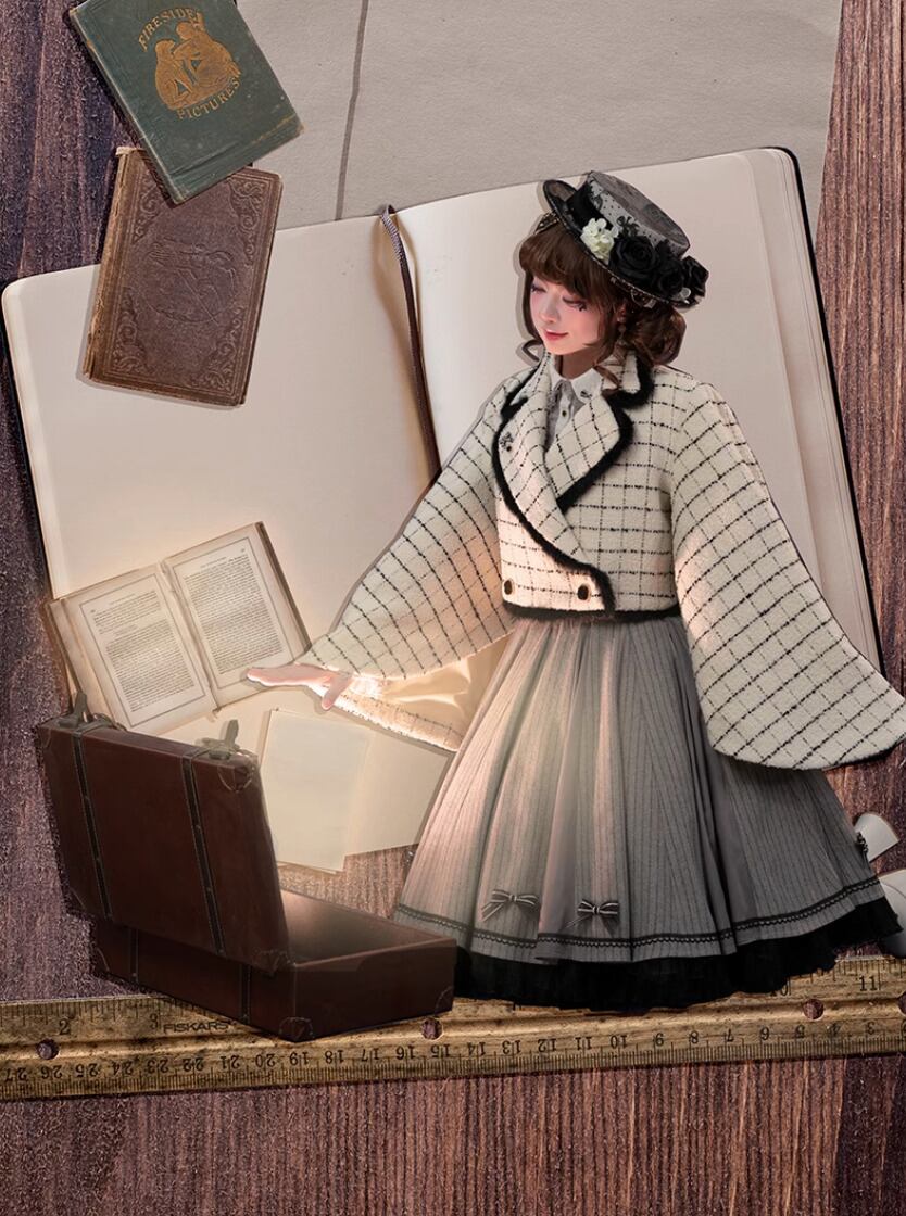 クラシカルロリータ クラロリ ケープ ボレロ チェック柄 プリント 長袖 ブラック&ホワイト ニット素材 春秋 カジュアル&フォーマル 森ガール 文学少女 ガーリー フェミニン レディースファッション