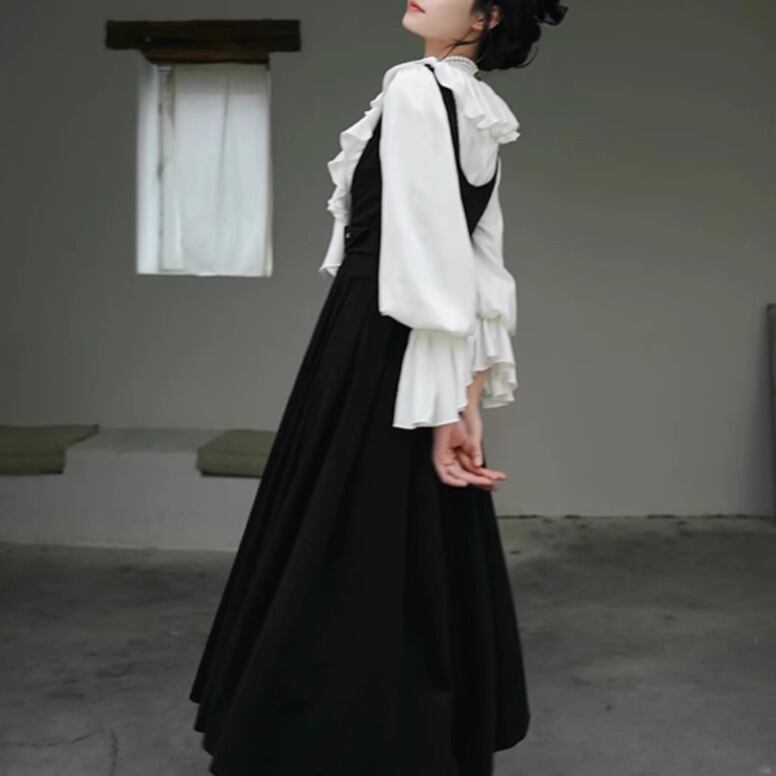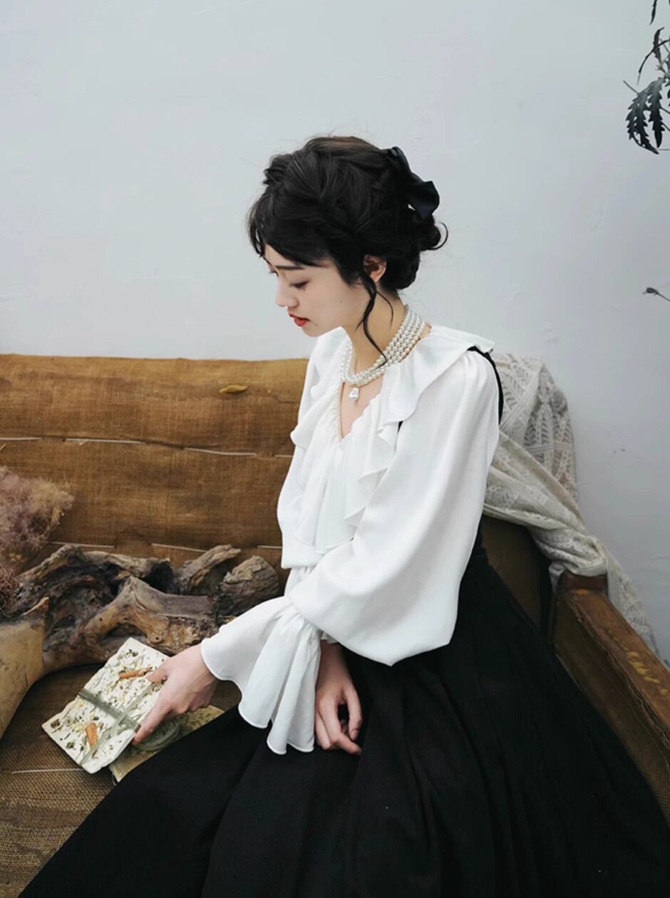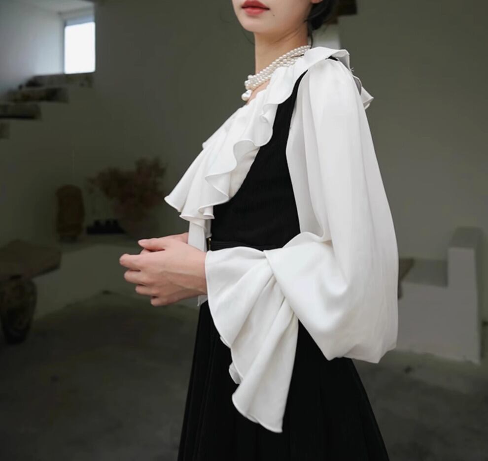 このブラウスは、フリル袖とフレンチクラシカルなデザインが魅力で、 春秋の普段着からデートや二次会、謝恩会まで幅広いシーンに最適です。