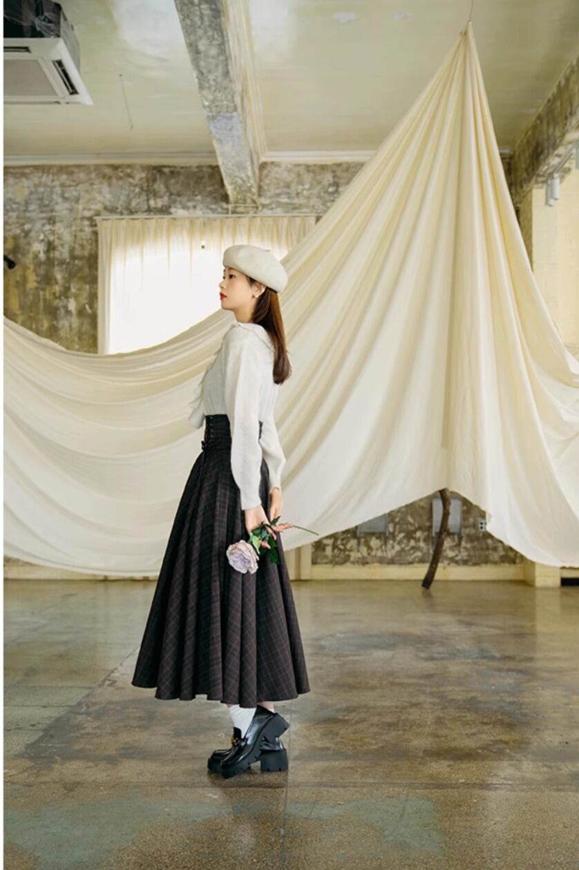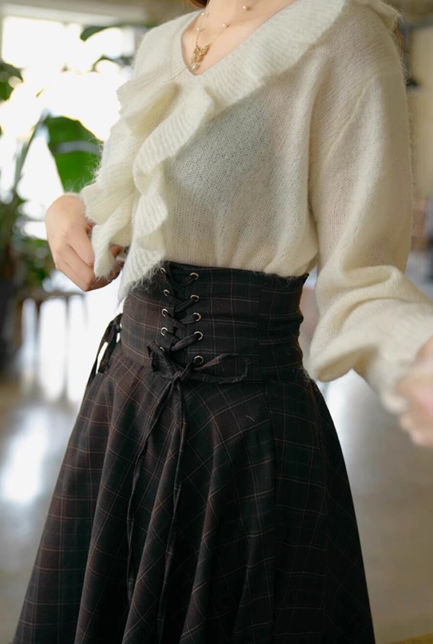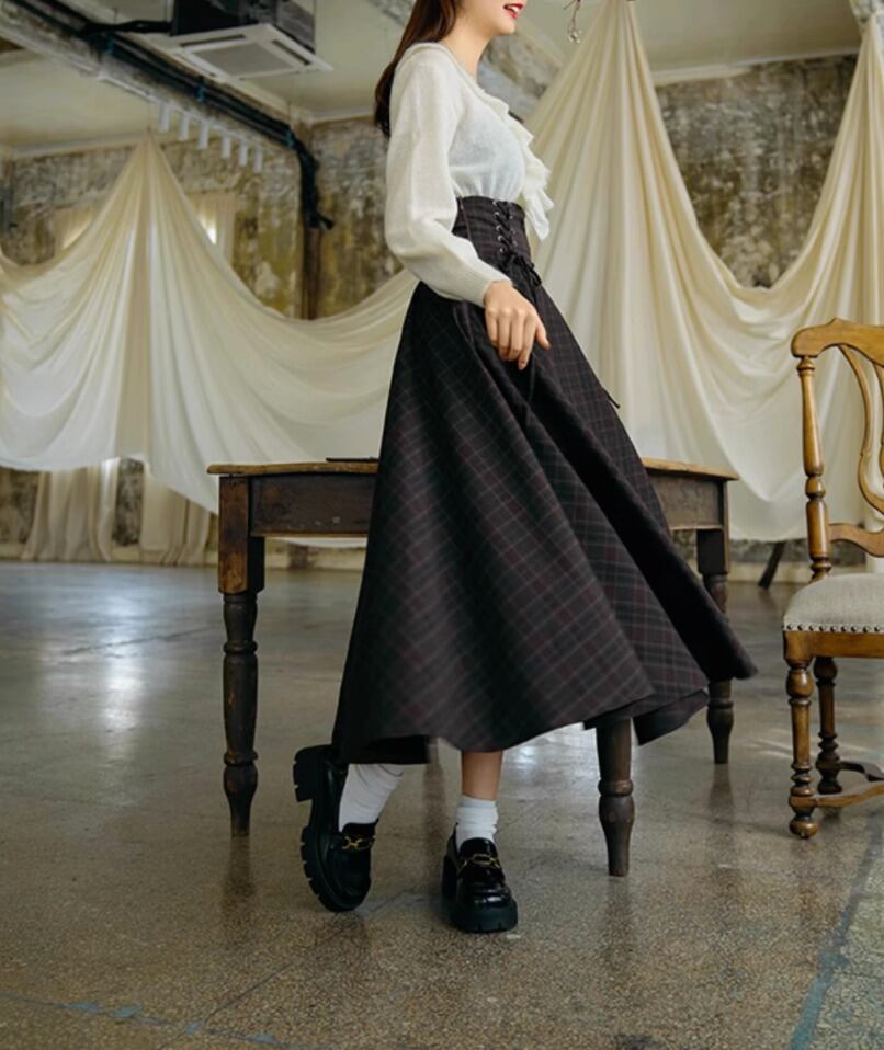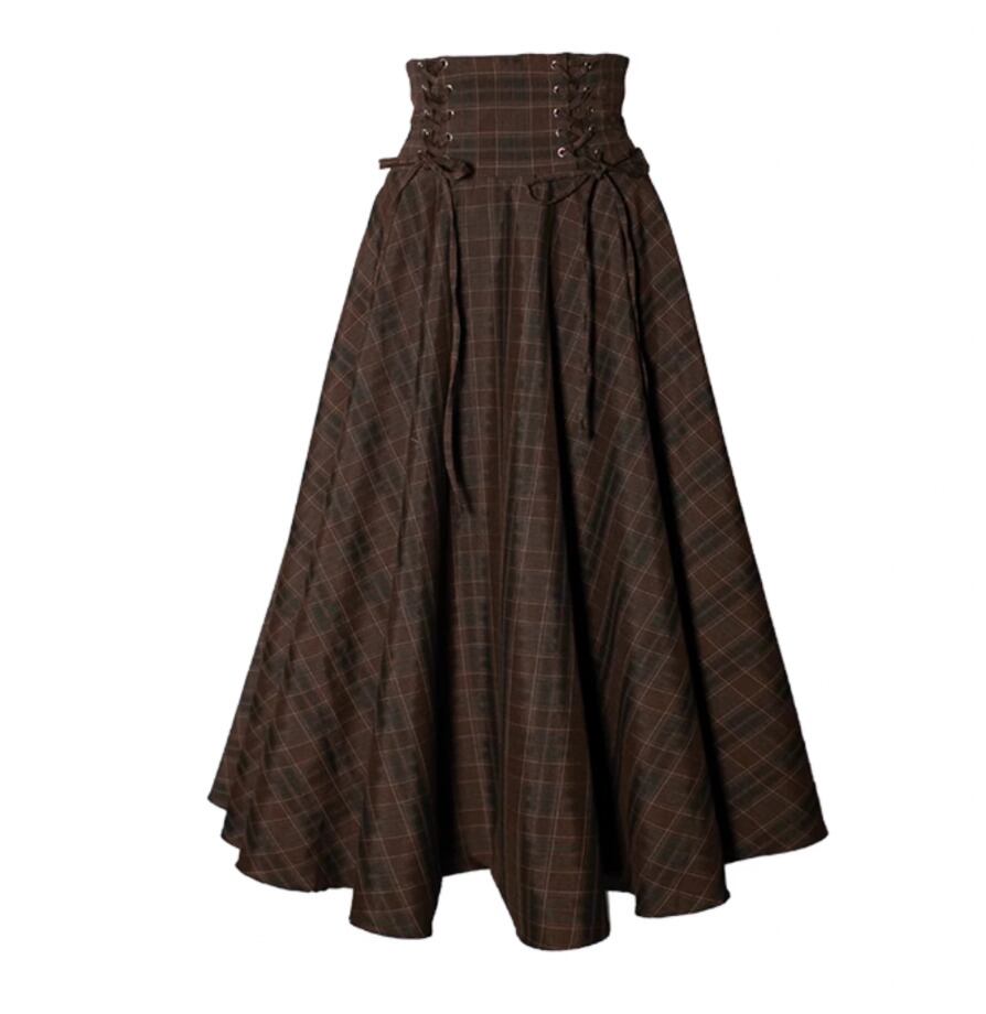 セミロリータ ハイウエスト フレアスカート コルセット ひざ下丈 ミモレ丈 ダークブラウン 宮廷風 ヴィンテージ チェック柄 大人可愛い 上品 清楚 パーティー 結婚式 二次会 秋冬コーデ
