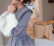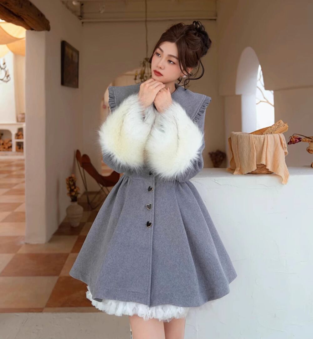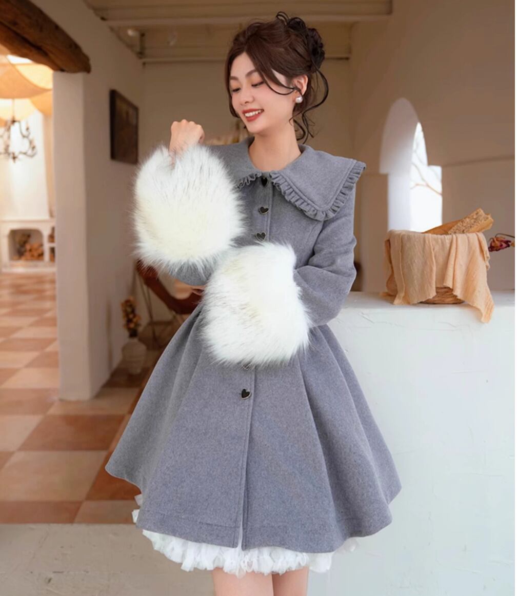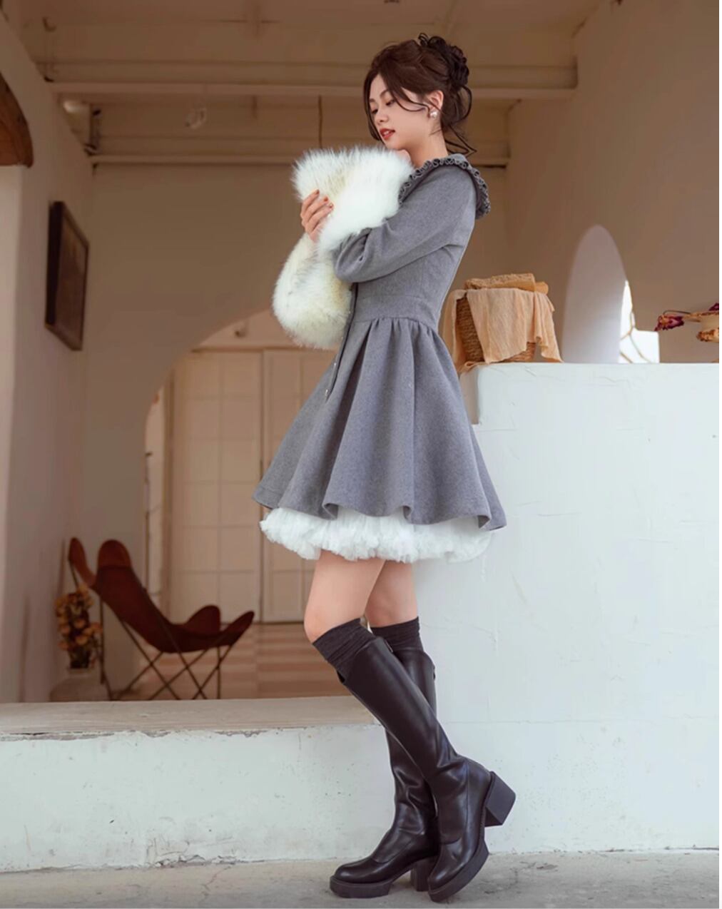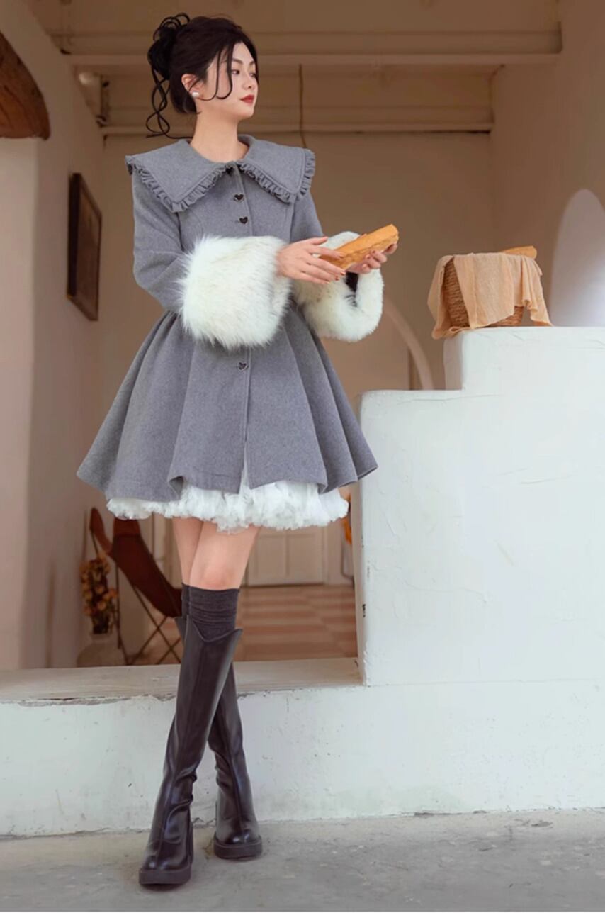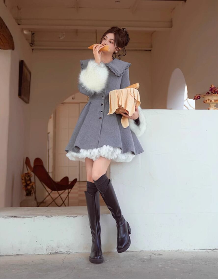 セミロリータ ハイウエスト プリンセスライン フレアコート + インナースカート フレンチレトロ ドール襟 ウール混 ファースリーブ グレー×ホワイト フリル 秋冬コーデ ガーリー スウィート フェミニン デート