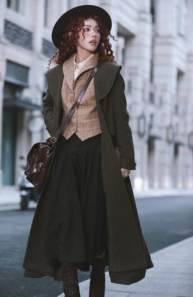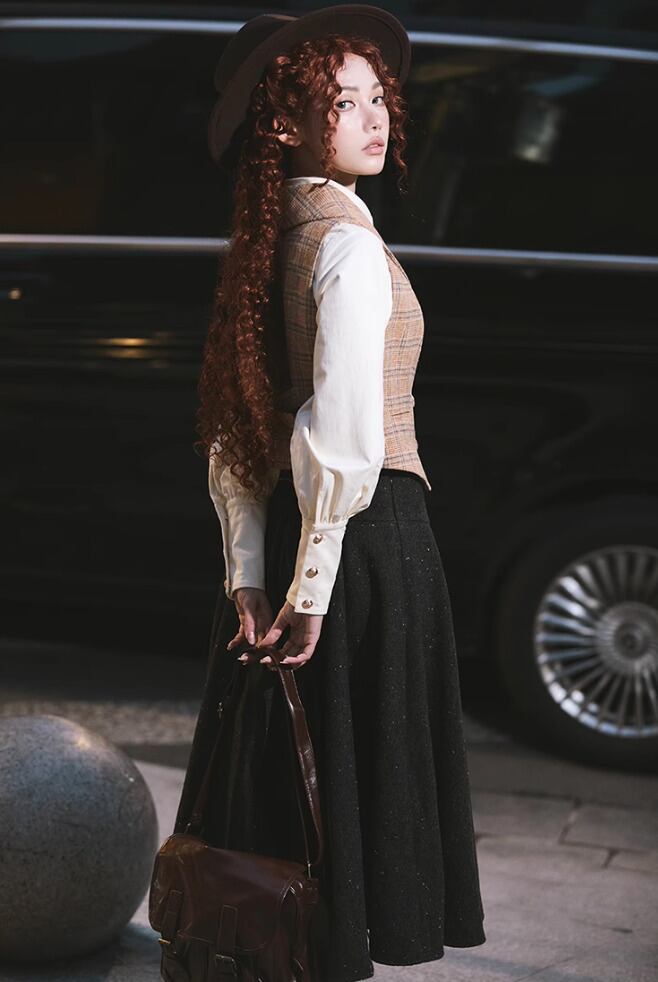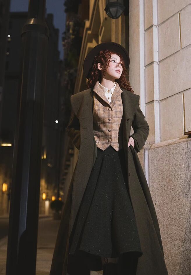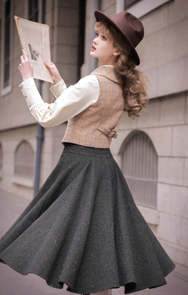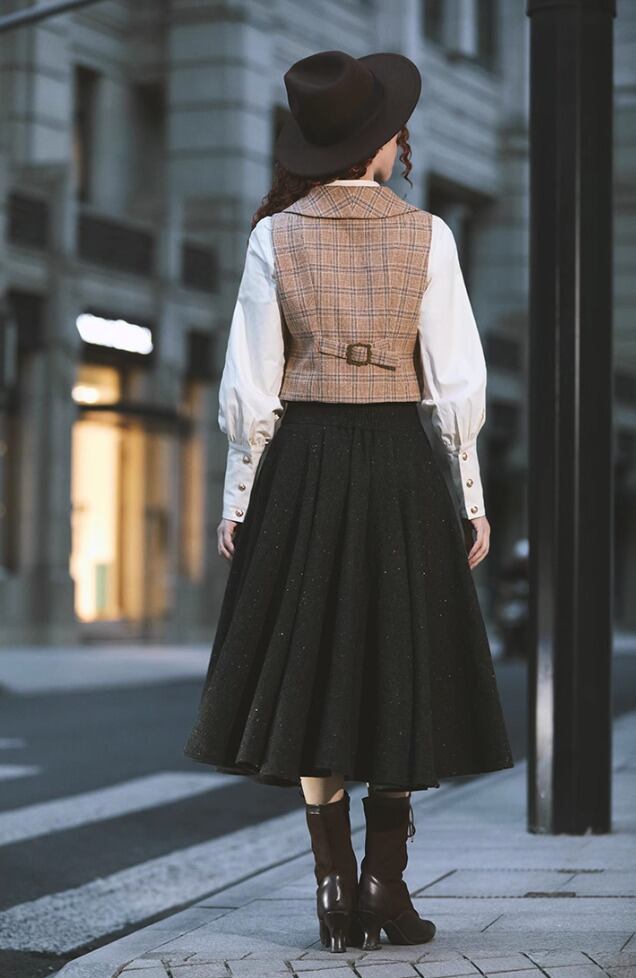 このスカートは、ひざ下丈とミモレ丈の優雅なデザインが特徴で、英国スタイルを感じさせる一品です。