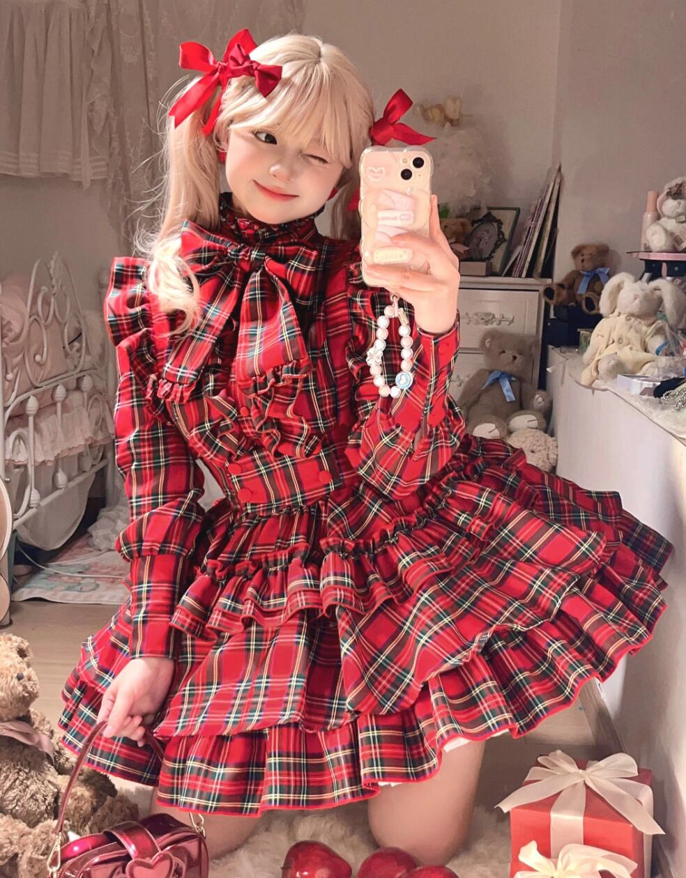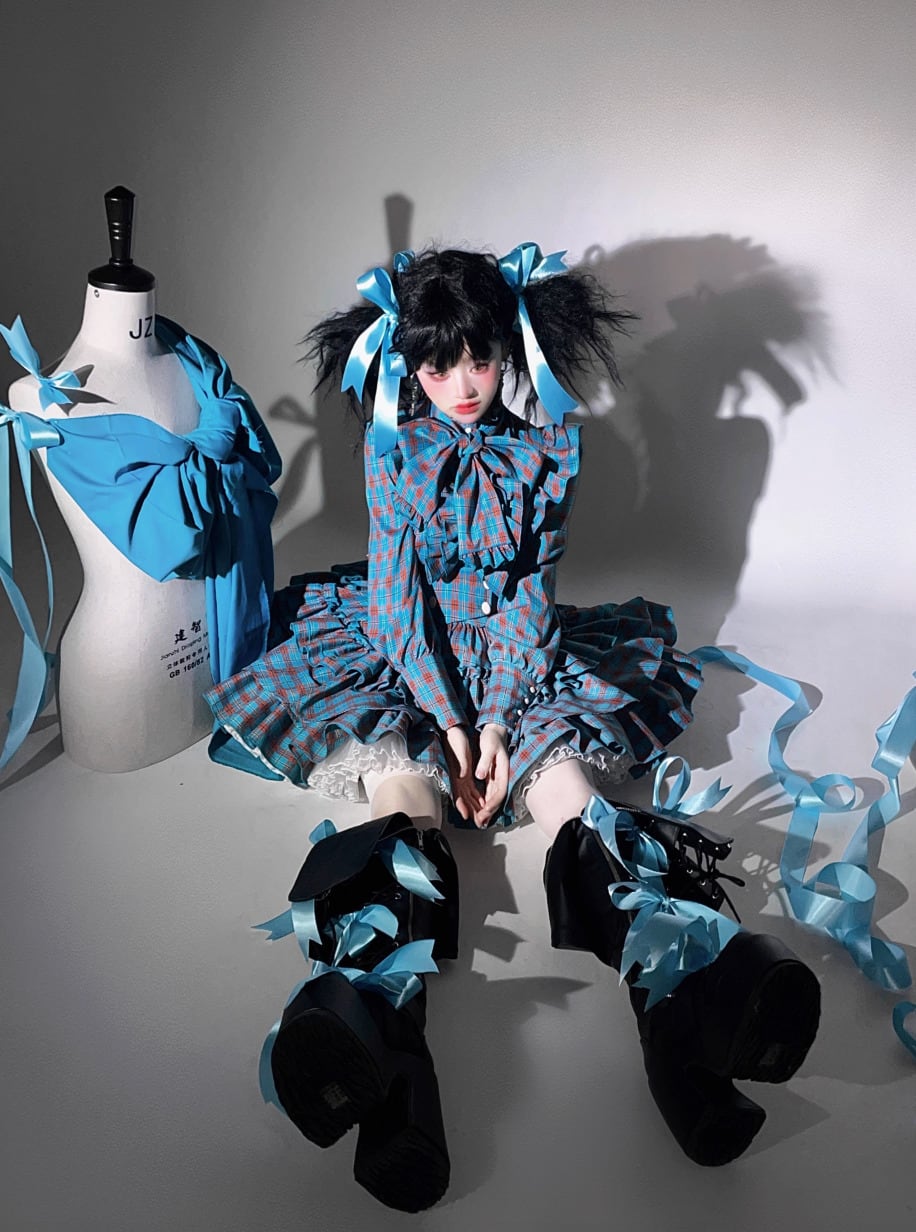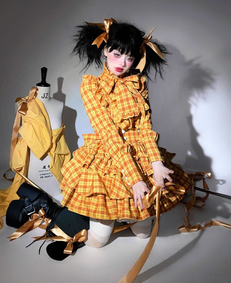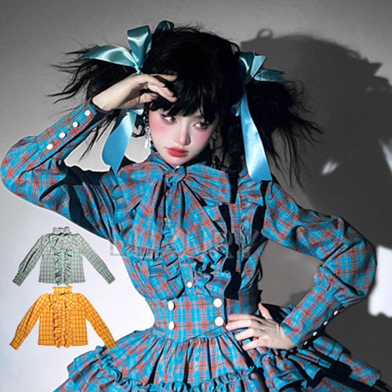 【納期130日】ゴスロリファッション ゴスロリ ブラウス のみ リボンタイ付き チェック柄 4色 長袖 立ち襟 ハイネック アジアン モード系 ガーリー ハード レディースファッション イベント 普段着 普段使い デイリー