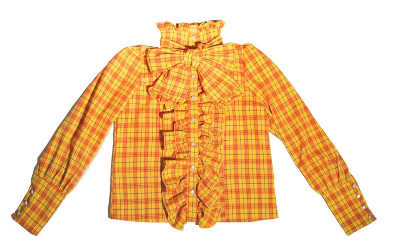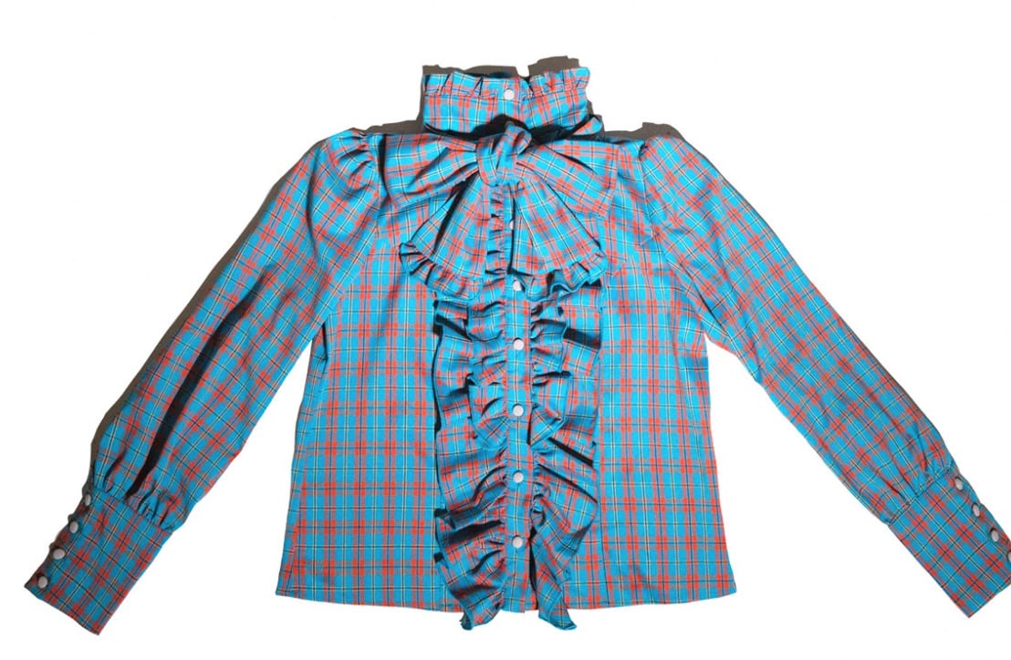 このブラウスは、チェック柄のデザインとハイネックが特徴で、立体的なシルエットで洗練された印象を与えます。