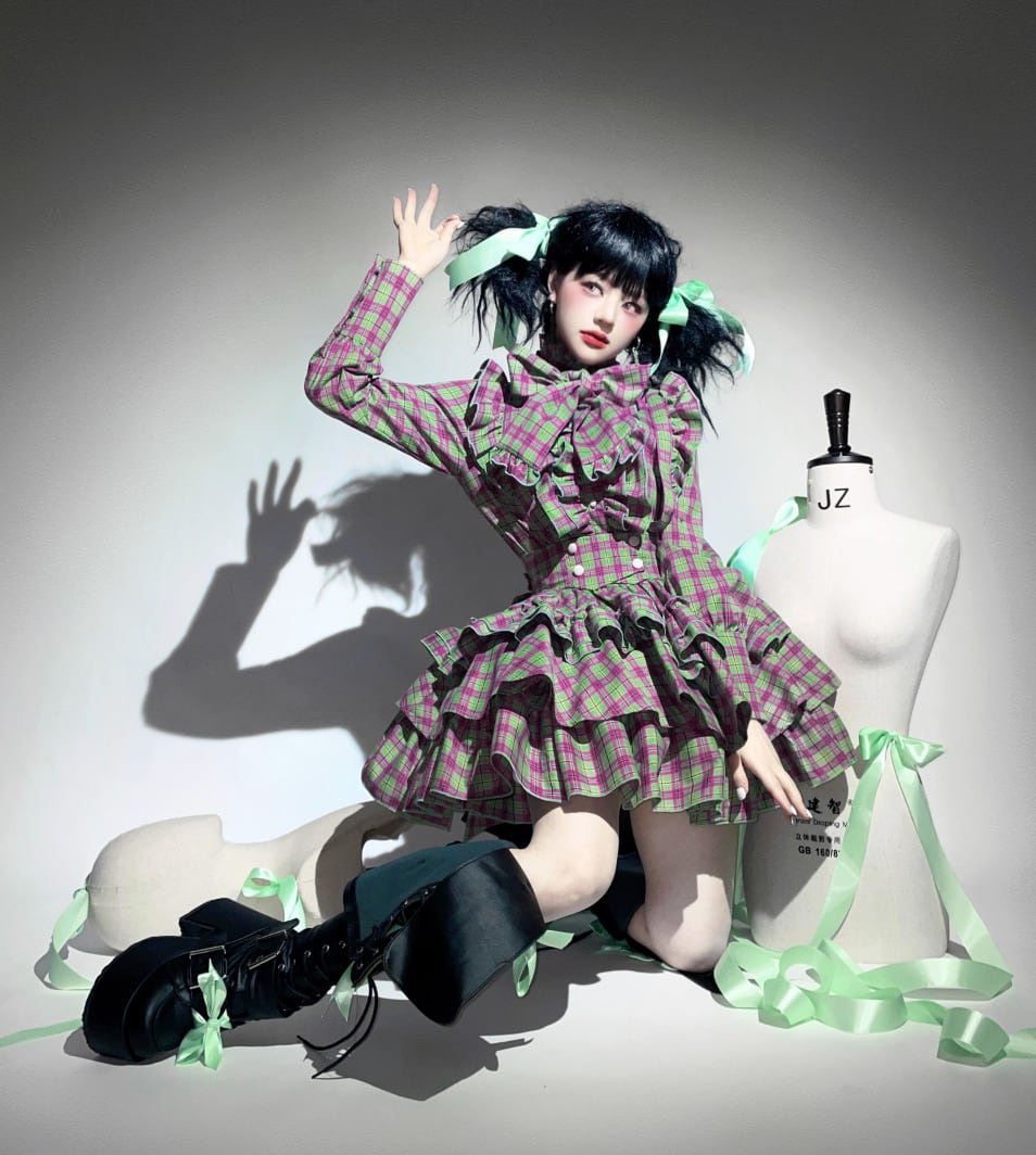 iScream着用 ゴスロリファッション ゴスロリ ブラウス のみ リボンタイ付き チェック柄 4色 長袖 立ち襟 ハイネック アジアン モード系 ガーリー ハード レディースファッション イベント 普段着 普段使い デイリー