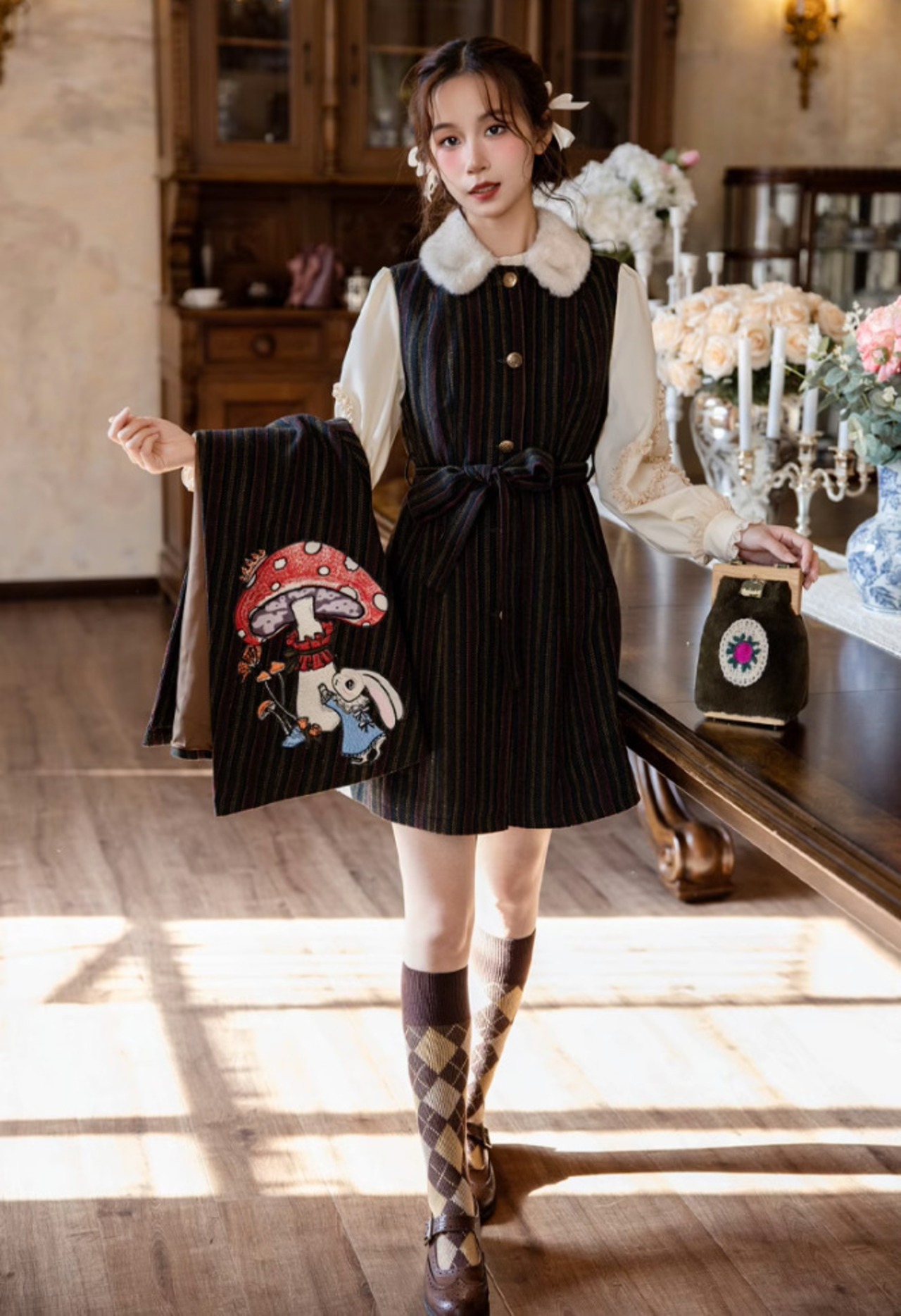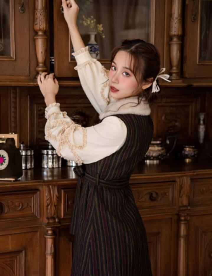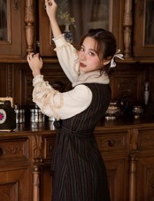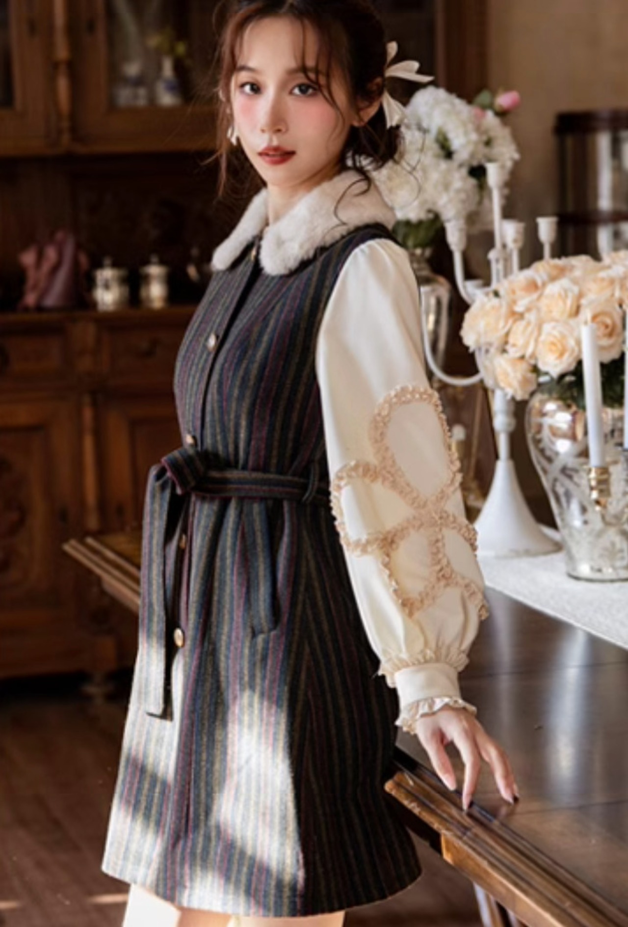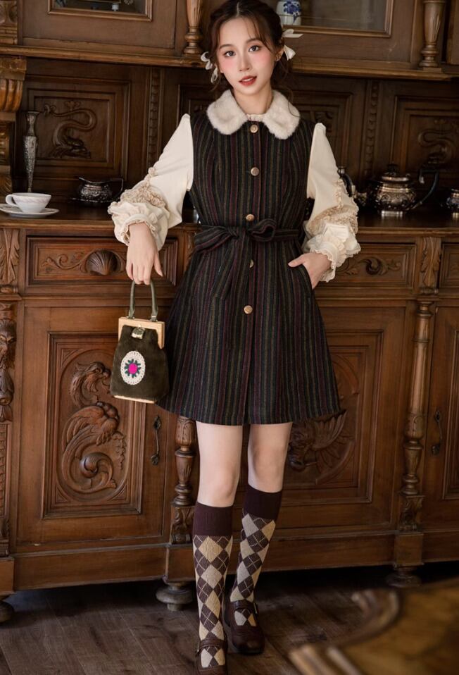 セミロリータ ノースリーブワンピース のみ ミニ丈 ショート丈 膝上 アメリカンレトロ ストライプ 大人可愛い 英国スタイル 英国風 秋冬コーデ ガーリー スウィート 普段着 普段使い デイリー