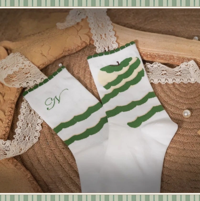 こちらの靴下は、ファンタジックなアップルデザインが特徴で、スウィートでガーリーな雰囲気を演出します。