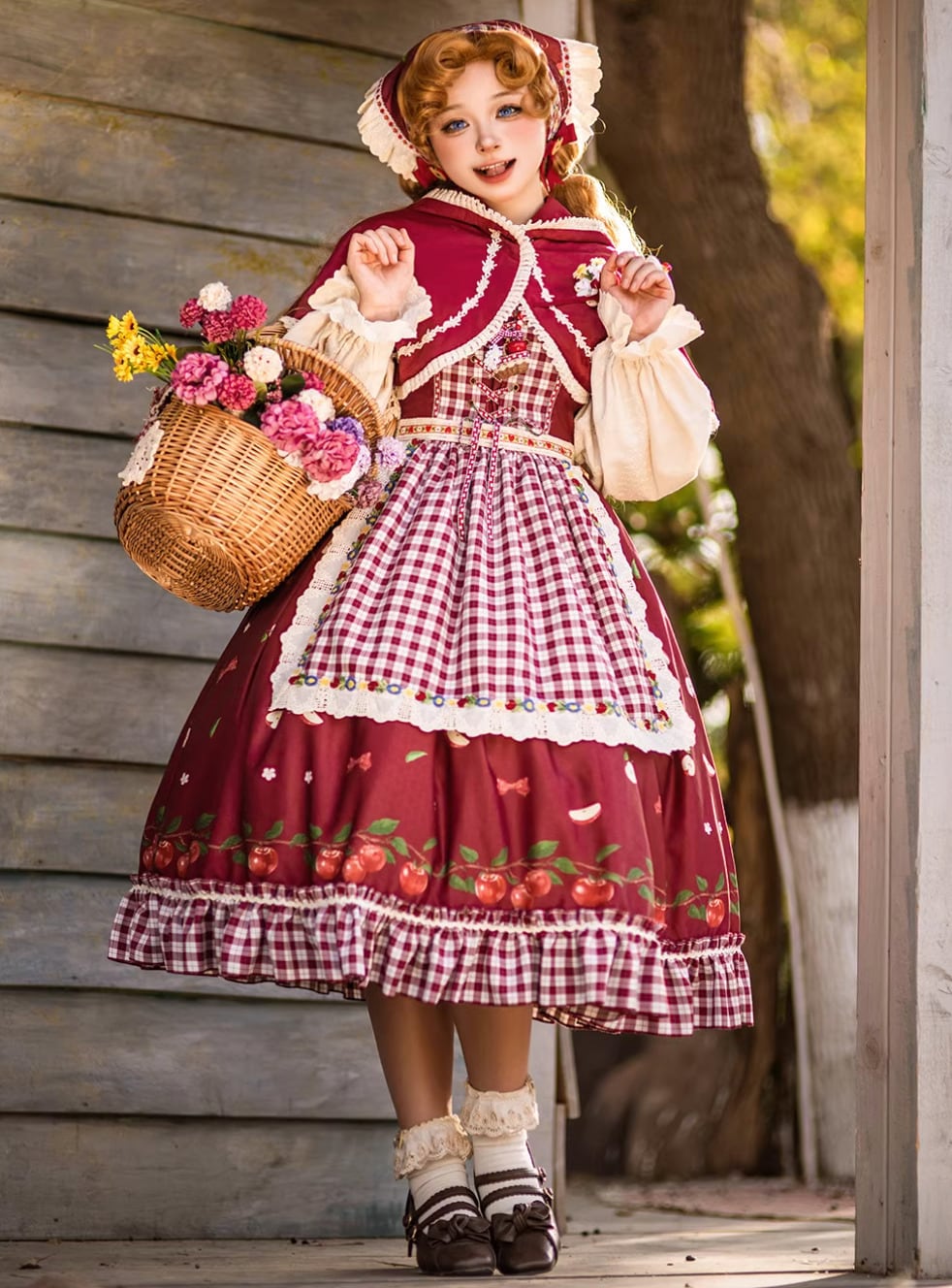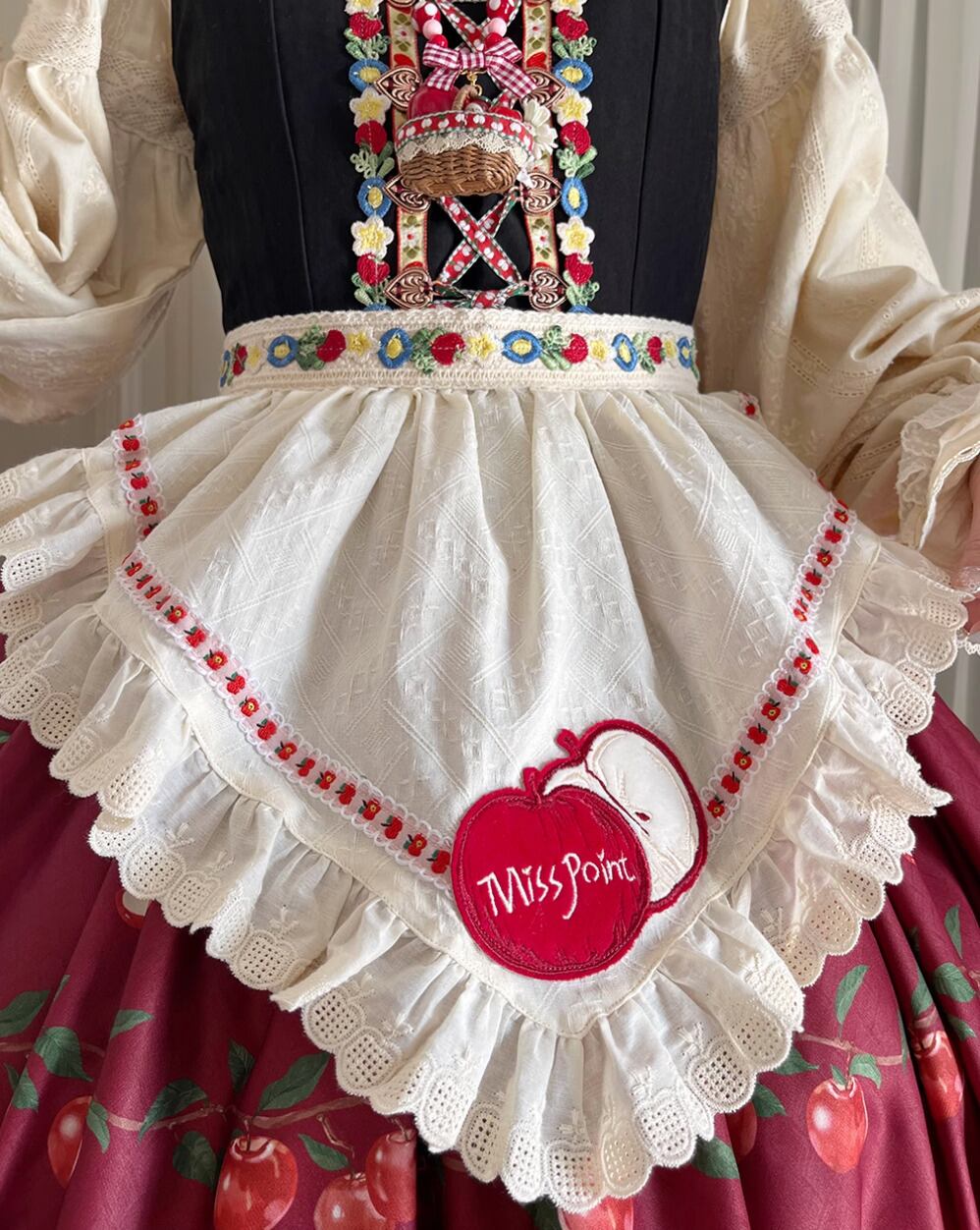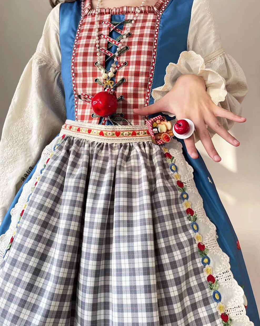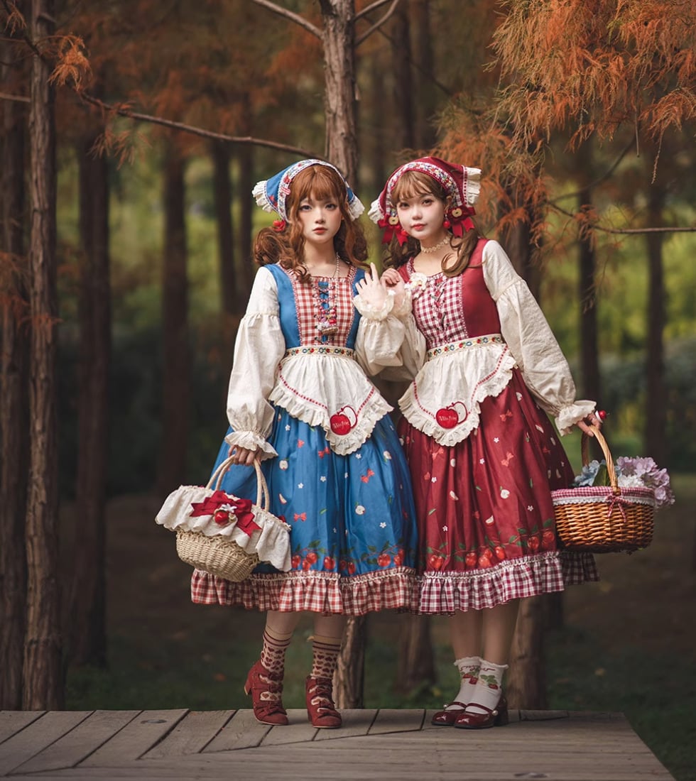 【納期40日】ロリータファッション エプロン のみ 4色 ギンガムチェック アップル フルーツ レース 森ガール 童話風 ガーリー スウィート かわいい レディースファッション イベント 森 ピクニック 田園